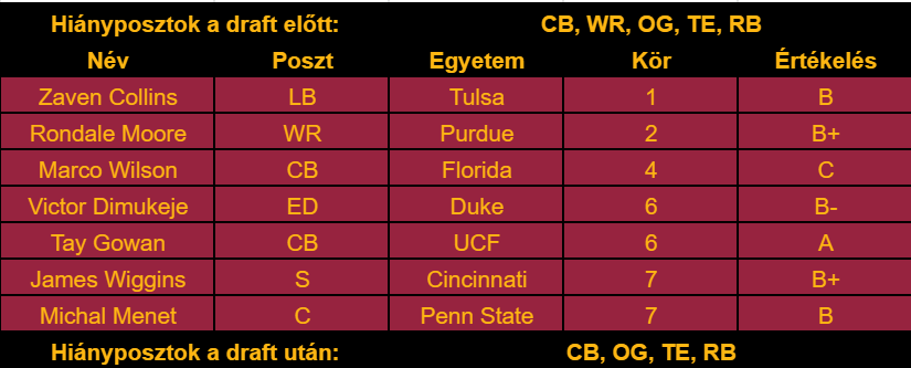 Érdekes drafton van túl a Cardinals. Collins és Moore személyében izgalmas játékosokat hoztak, akikre oda kell majd figyelni a pályán. Előbbi azonban nem a legnagyobb hiányposztra jött, utóbbi pedig nem lesz első számú célpontja Murray-nek. A cornerbackek közül véleményem szerint nem a negyedik körben választott Wilson, hanem a hatodik körös Gowan a jobb prospect, a többi harmadik napos játékosnak pedig harcolniuk kell, hogy helyük legyen a végső keretben. Az idei drafton lévő választásai jogaikkal akkor gazdálkodtak a legjobban, amikor a harmadik körös pickjükkel megszerezték Rodney Hudsont a Raiderstől, ő az, aki fontos poszton azonnali erősítést jelent – ha őt is hozzávesszük, akkor nem olyan rossz az idei draftjuk.