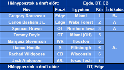 Összességében a Bills inkább a jövőnek, mintsem a jelennek húzott, amiért nem feltétlenül lehet megfedni őket. A két pass rusher már idén is nagy segítségére lehet a csapatnak, de mindkettőjüknek időre van szüksége mire teljes értékű kezdők lehetnek. A többiek már egyértelműen hosszú távú projektek, akik ha nincs sérülés nem is nagyon fognak még játszani. Nem gondolnám, hogy olyan sokat erősödött a gárda, de ha a pass rush fel tud éledni, akkor még jobbak is lehetnek mint tavaly voltak.