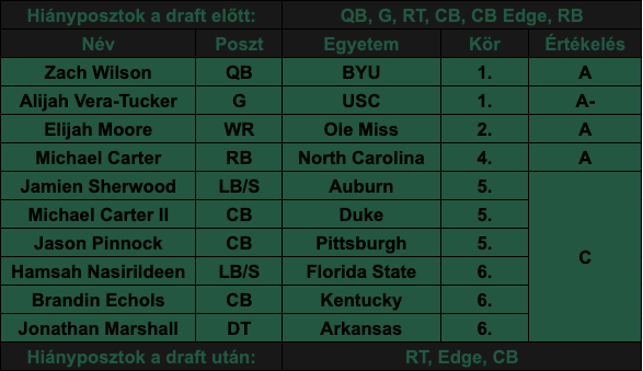 A Jets rákfenéje volt az utóbbi években, hogy volt egy magasan draftolt irányítója, de minimális szinten sem tudtak csapatot, vagy legalább támadósort építeni köré. Az azonnal látszik, hogy a legújabb fiatal QB-t egy sokkal jobb repülőgépbe akarják beültetni, amit könnyebb lesz kormányoznia. A Jets draftja ugyanis arról szólt, hogy Zach Wilsonnak minél jobb dolga legyen New Yorkban.