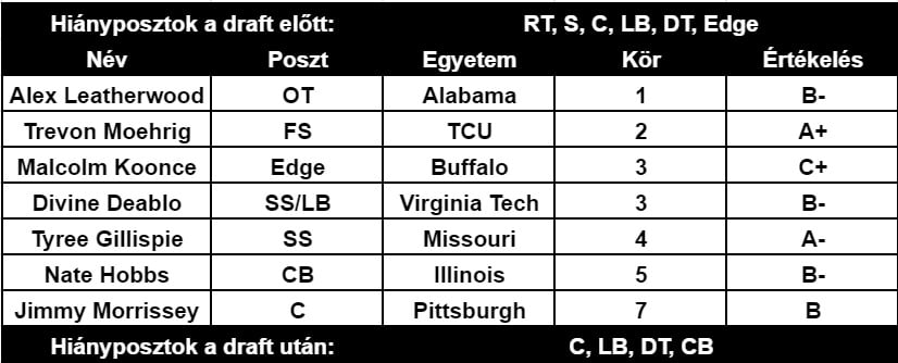 Újabb felemás drafton van túl a Raiders. Sokakkal ellentétben Leatherwood kiválasztását nem gondolom annyira rossznak, mert minden bizonnyal megtalálják a helyét a támadófalban, bár tény, hogy nem a megfelelő értéken lett húzva. Moehrig az első naptól kezdő lehet, és erősítést jelent a tavaly még liga legaljához tartozó védelem számára. Koonce és Deablo két project, akikben az atletikusságuk miatt van potenciál, de sokat kell fejlődniük ahhoz, hogy kezdők legyenek, főleg mivel utóbbi még posztot is vált. Gillispie, Hobbs a rotációban kaphatnak szerepet a secondaryben, Morrissey pedig cserecenter lehet, ha minden jól alakul. Center posztra korábban hoztam volna embert, és egy guardra is beruháztam volna, mert Richie Incognito 38 éves, Denzelle Good legfeljebb egy átlagos játékos, John Simpson pedig még kérdőjel. 3 tech posztra szintén jöhetett volna játékos, ide csak UDFA érkezett. OL vagy DL húzás értékesebb lehetett volna a 4. körben, mint másodjára safetyt húzni.