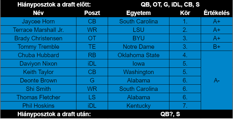 Fitterer első draftja összességében jó lett, simán elképzelhető, hogy hat kezdőt is sikerült draftolnia, ami kiemelkedő. Érezhető, hogy ő és Rhule együtt dolgoztak, és nem egymás ellen, mert sok olyan játékos érkezett, akit más edző kezei alatt nem szívesen néztem volna meg, itt viszont remek fitek lehetnek.