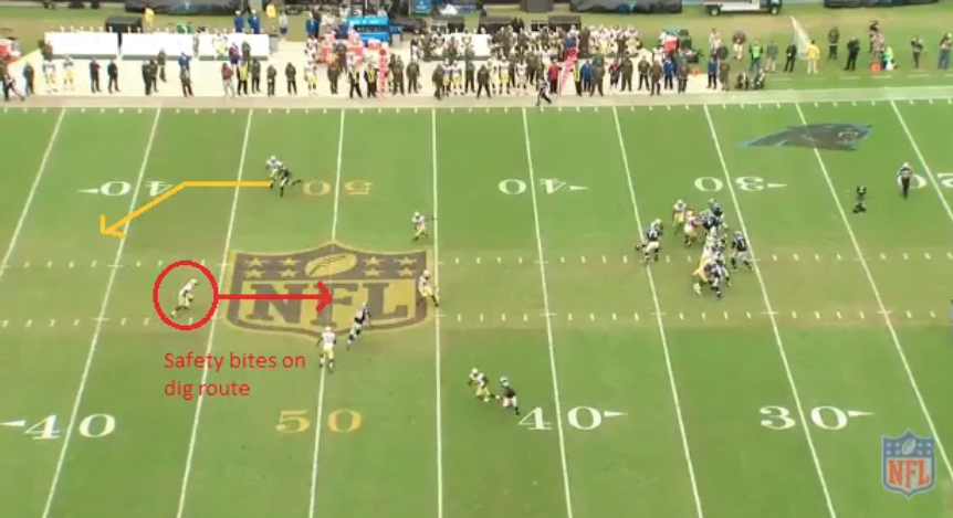 Az irányító az alapján dönti el, hogy kinek passzol, hogy mit csinál a free safety. Alapvetően úgy van kialakítva a játék, hogy a safety először a keresztező dig útvonalat lássa meg maga előtt, így arra lépjen fel, besegítve a várhatóan lemaradó cornernek. Ha így tesz, akkor mehet be mögé a mély labda a post útvonalat futó elkapónak, aki egy az egyben lesz az őrzőjével, így már csak az a dolga, hogy lefussa/kiszorítsa.