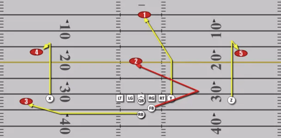 A Yankee egy kétútvonalas koncepció, mindenki más marad blokkolni. Kell is a max protection, mert lassan kialakuló kombinációról van szó két mélységi útvonallal – a play action külön segít ezen a játékon egyébként, sokat is használják így. Az egyik oldalról a WR egy post útvonalat fut, a másik oldalról pedig egy dig érkezik. Ez a kettő pedig az egyedüli hátsó safetyt igyekszik nehéz helyzetbe hozni.