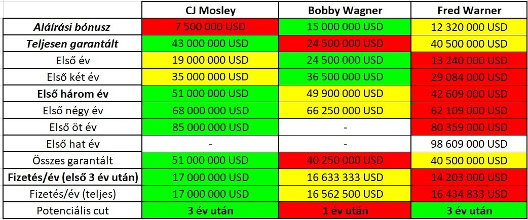 Lynch javára legyen mondva, minden fineszét bevetette. A szerződés egy elég alacsonynak számító 12,32 millió dollárnyi aláírási bónuszt tartalmaz, amit leosztott a csapat öt évre. Ezen kívül teljesen garantált még Warner 2021-es alapfizetése, 2022-es roster bónusza (kék) és 2022-es alapfizetéséből 1,58 millió dollár. Ez kereken 27,5 millió dollárt jelent, ami nem olyan sok egy 5 éves, 95 millió dolláros szerződés esetében. Ugyanakkor a barnával jelölt 2023-as alapfizetése 2022-ben garantálttá válik, ami technikailag azt jelenti, hogy a védőnek mindennel együtt 40,5 millió dollárnyi garantáltja van.