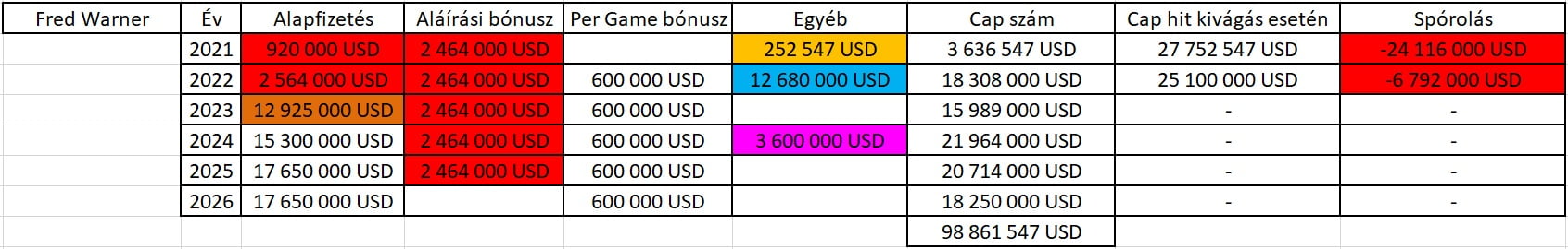 A lilával jelölt 3,6 millió dollár egy visszavásárlási opció, Warner szerződéséből ugyanis a 2025-ös és 2026-os évek automatikusan megszűnőek. Ellentétes információk jelentek meg azzal kapcsolatban, hogy a 2024-es idény előtt vagy után lehet-e élni vele, így ebbe a részbe nem is megyek bele, mert az csak nettó találgatás. A lényeg: ha a 49ers él az opcióval, akkor Warner kap 3,6 millió dollárt a számlájára, és nem lesz a 2024-es szezon után szabadügynök.