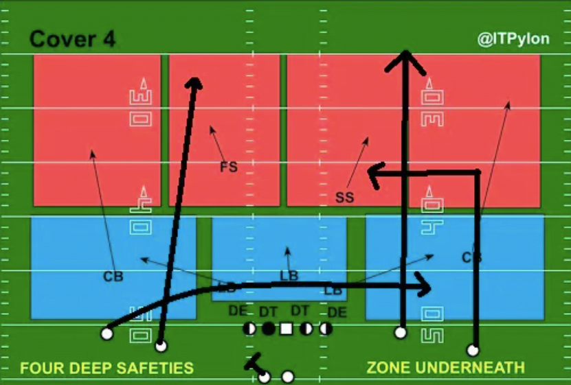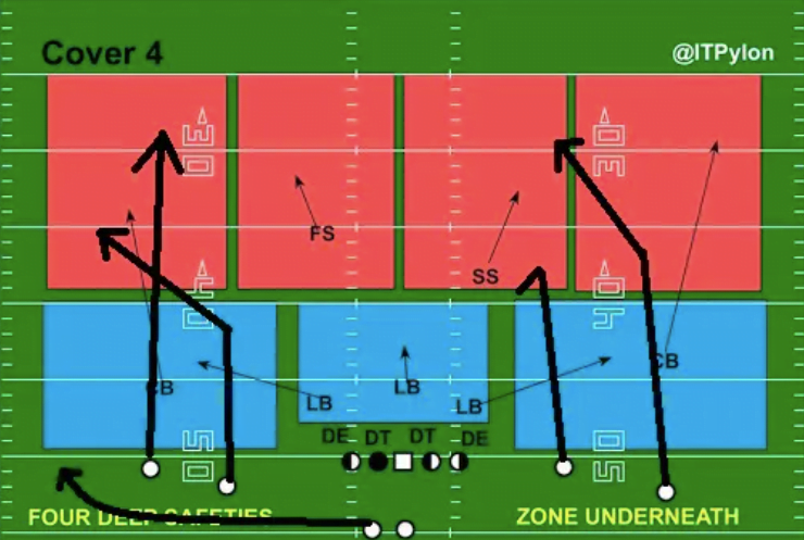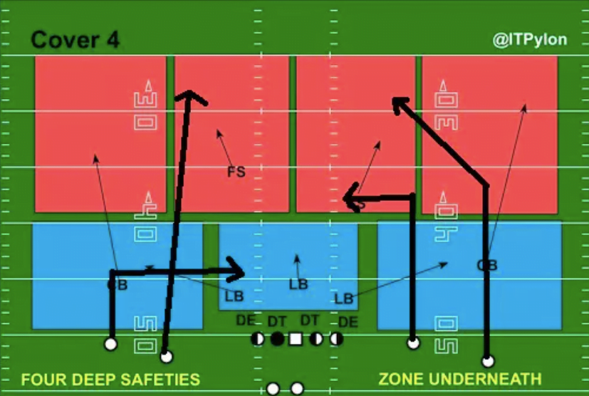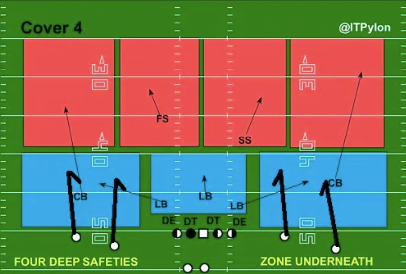 A Cover4, vagy más néven Quarters coverage értelemszerűen négy mély védővel operál, általában két safetyvel középen és két cornerbackkel a szélen, ők negyedelik fel a hátsó régiót. Ez tehát azt jelenti, hogy (négy védőfalemberrel számolva, akik támadják a QB-t) mindössze három underneath védőt tud felmutatni ez a fajta védekezés. Nekik kellene lefedni szélességében a pályát, ami már a Cover3 esetén négy emberrel is nehézkes feladat volt, szóval az első gyengeséghez már előre is tudunk tekinteni ezzel a ténnyel.