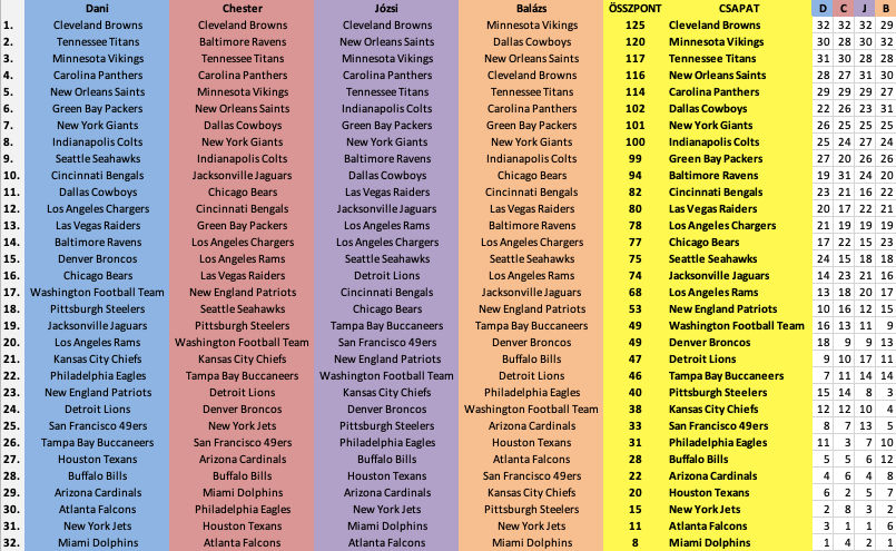 Én is remélem a 15-öt, de félek, hogy megint előrébb leszünk ebben idén is, sajnos (a passz játék rováßára). De ez csak játék. Vannak ilyen benézések, mert ha a hú de nagyon jó 1 db futó lesérül kb 30% valószínűséggel, akkor kuka az év futásból, ezért mi ezeket a csapatokat, ahol ez a szomorú eset bekövetkezik, biztosan előzzük majd bármi is lesz.