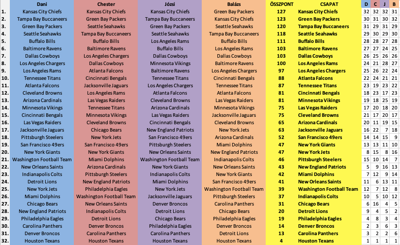 Négyen vállalkoztunk erre a nemes feladatra (Balázs, Chester, Dani és Józsi), és természetesen az irányítókkal kezdjük a rangsorolást. Itt két kitételt fontos megjegyezni, mielőtt rátérünk a listára: egységesen úgy számolunk, hogy Aaron Rodgers a Packers játékosa, illetve hogy Deshaun Watson nem játszik a Texansban. A rangsorolási szempont pedig az volt, hogy melyik csapatnak jobbak az irányítói jelenleg, csak erre a szezonra vonatkozólag.