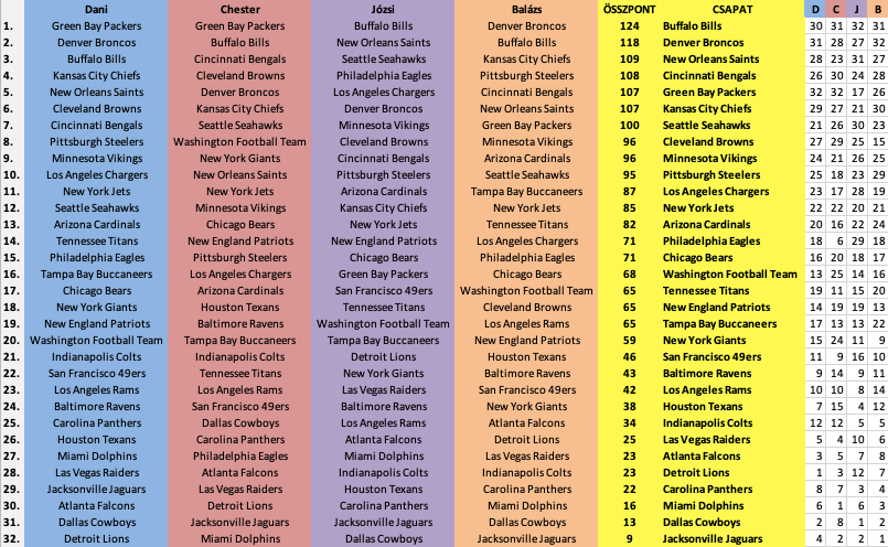 Az alapján állítottuk fel az egyéni listáinkat, hogy jelenleg, tehát csak a 2021-es szezonra vonatkozólag kinek milyen a kerete az adott poszton. Mind a négy szerkesztő véleménye egyenlő súllyal számított az összesítésnél, holtverseny esetén előbb a két legszélsőségesebb vélemény (legmagasabb és legalacsonyabb pontszám) kivételével létrejött pontszám, majd a legmagasabb helyezés döntött.
