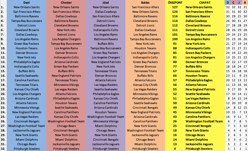 Az alapján állítottuk fel az egyéni listáinkat, hogy jelenleg, tehát csak a 2021-es szezonra vonatkozólag kinek milyen a kerete az adott poszton. Mind a négy szerkesztő véleménye egyenlő súllyal számított az összesítésnél, holtverseny esetén előbb a két legszélsőségesebb vélemény (legmagasabb és legalacsonyabb pontszám) kivételével létrejött pontszám, majd a legmagasabb helyezés döntött.