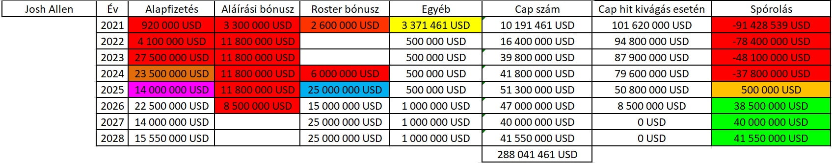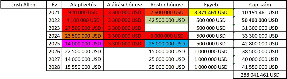 Szokás szerint a sárgával jelölt tétel a korábbi szerződéséből átcsúszó aláírási bónusz. Az új szerződés aláírási bónusza 16,5 millió dollár, amit a csapat majd szépen leoszt 5 évre. Ezen kívül van 2,6 millió dollárnyi teljesen garantált roster bónusza 2021-ben és 2024-ben, továbbá a 2021-es, 2022-es és a 2023-as alapfizetése, illetve 1,5 millió dollár a 2025-ös fizetéséből, valamint a 2022-es 42,5 milliós opciós bónusza (zöld) is teljesen garantált. Ez összesen 101,620 millió dollár teljesen garantált tartalmat jelent, ami rekord az NFL-ben, megdöntve ezzel Dak Prescott 95 millió dolláros csúcsát.