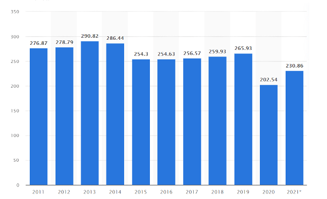 1. A kaszinó és az online szerencsejáték ipar piacának mérete világszerte 2011-2021 között