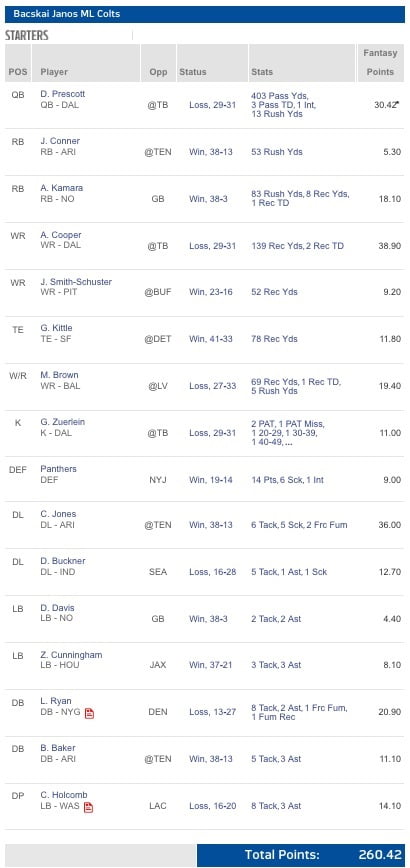 Bácskai János ML Colts kihozta a rosteréből a legtöbbet, a padján is alig maradt pont. Eleve jól kezdett, ugyanis Prescott és Amari Cooper rögtön 68 pontot szállított, és még az is belefért, hogy James Conner nem csinált szinte semmit. Ráadásul a védelem is odatette magát: Chandler Jones nyilván egy állat volt, 36 pontot ritkán látunk védőtől, de Logan Ryan 20 pontja is szép.