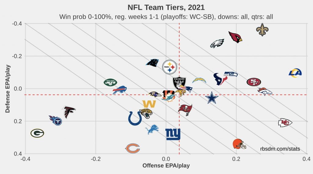Erre jó az EPA/play mutató, amiből megtudhatjuk, mennyire volt hatékony egy csapat, jelen esetben támadókra és védőkre is lebontva. Chad Graff ugyanis összeállította az alábbi grafikát, ahol az X tengelyen a támadók, az Y tengelyen pedig a védők játékonkénti várható hozzáadott pontjait láthatjuk.