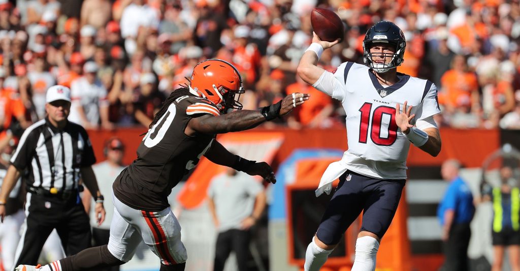 Ezzel szemben most az újonc Davis Mills lép pályára a Panthers ellen, akiről ezek koránt sem mondhatóak el. Ő már csak 44.5%-kal találja meg a célpontjait és kevés játékperce is elegendő volt ahhoz, hogy háromszor több labdaeladást ígérő átadása legyen, mint Taylornak. A Browns például remekül ismerte fel, hogy a fiatal QB mennyire nem komfortos, így amikor megtörtént a Taylor-Mills csere, egyből közel 20%-kal megtoldotta azon játékai számát, amikor 6 vagy 7 ember küld a boxba, hogy a Texanstól elvegyék a futás esélyét. Így az újonc irányítót mindenképp passzra kényszerítettek, aminek meg is lett a gyümölcse.