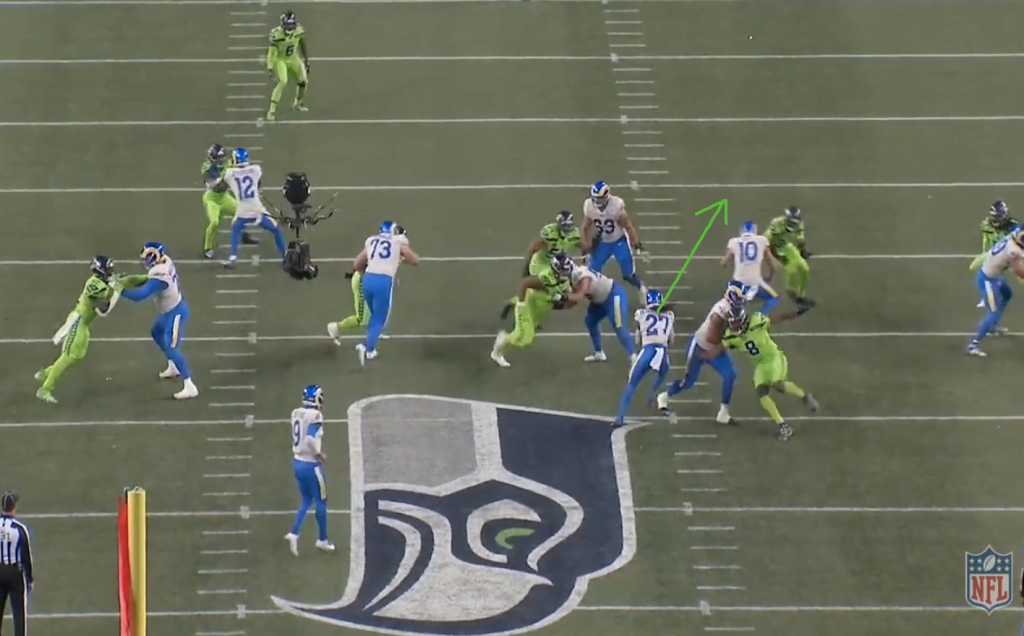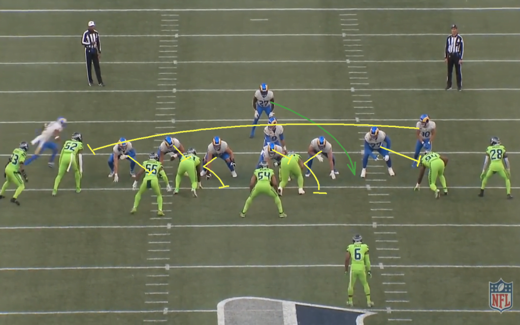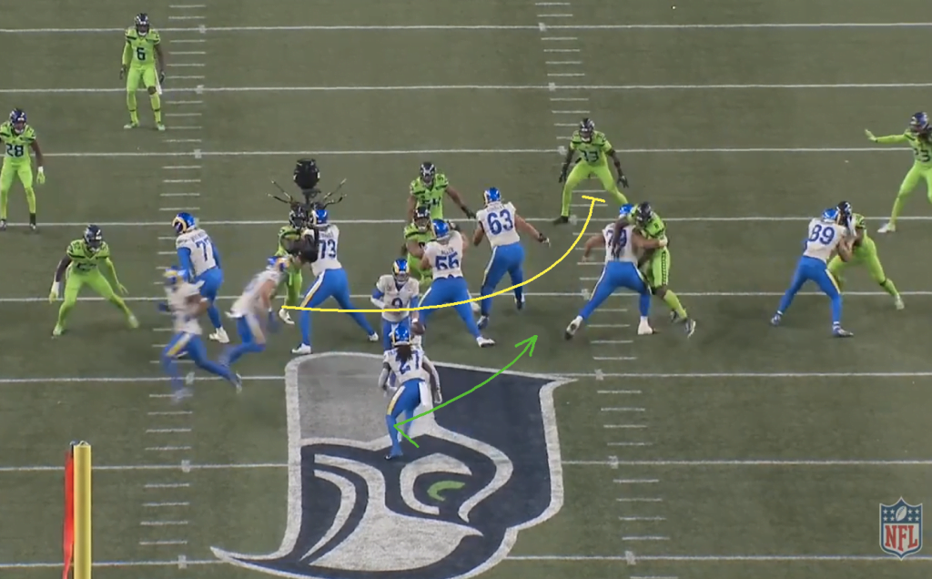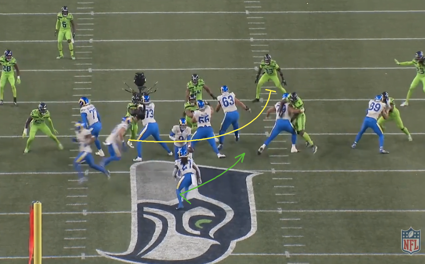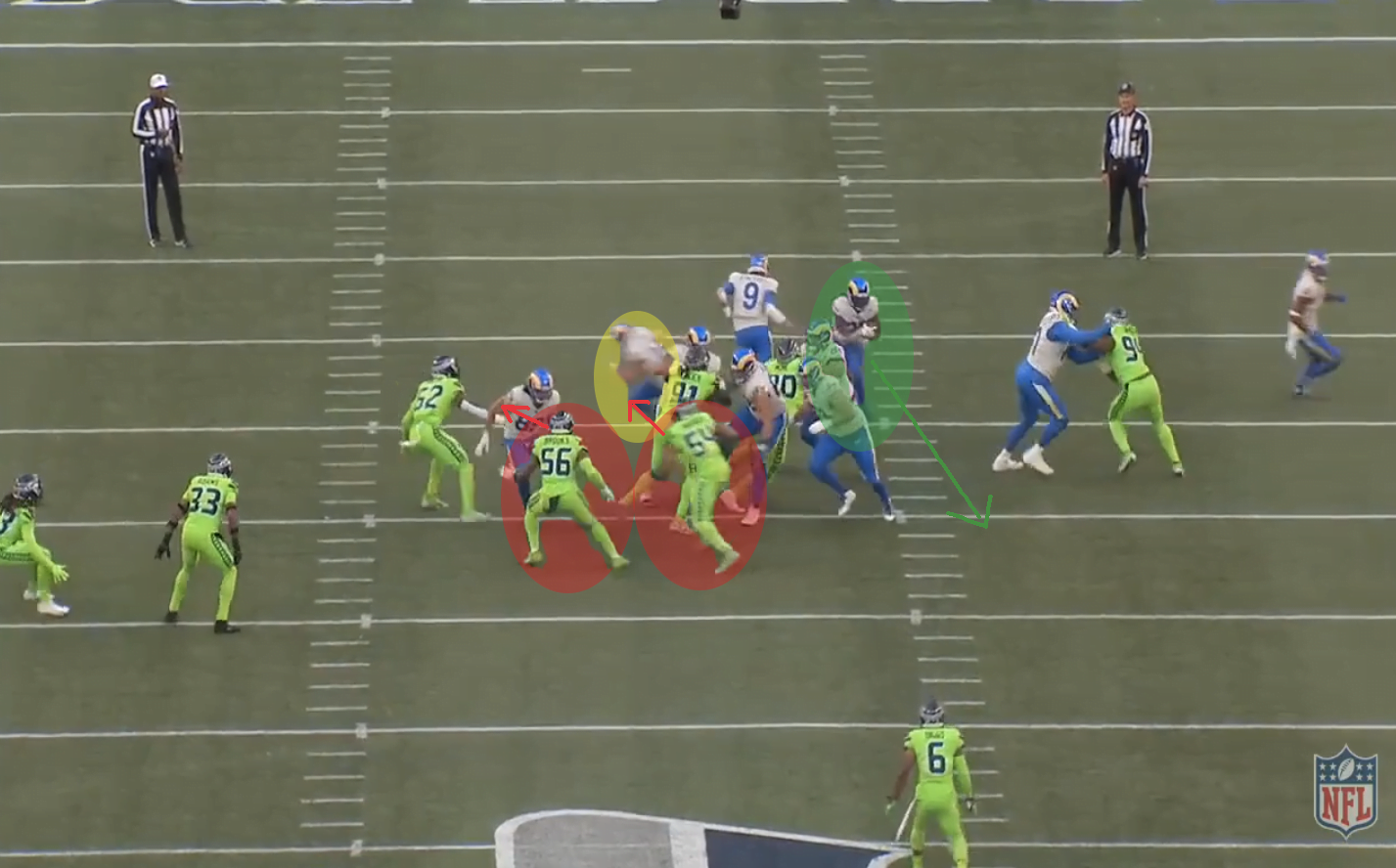 A split zone azért nagyon jó játék, mert a keresztbe mozgó ember (jelen esetben Kupp) elvonja a linebackerek figyelmét és minimum hezitálásra készteti őket, jó esetben pedig el is mozdulnak az irányába. Ez történik most is, Bobby Wagner és Jordyn Brooks is megeszi a split zone-t, így Henderson óriási lyukba törhet be a bal oldalon.