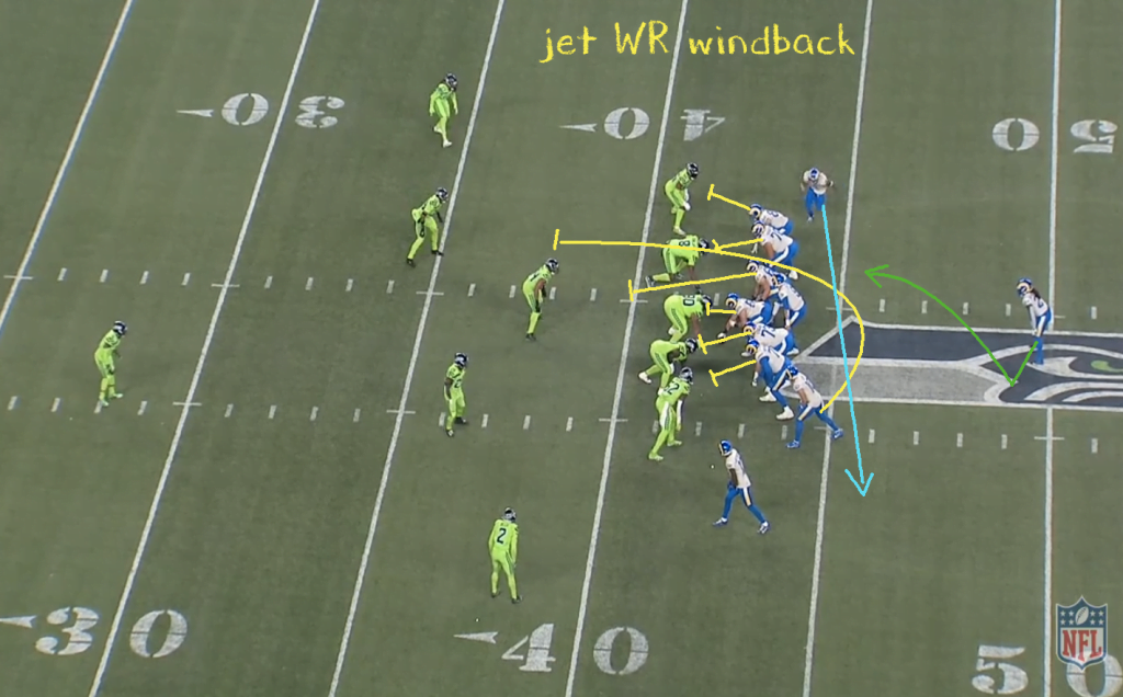 Ez egy jet WR windback játék. Pontosan ugyanaz a felállás snap előtt, mint az előbb, illetve itt is van egy jet motion balra Woodstól a snap közben és Kupp is a jobb oldalra indul el a snap után, ahogy a futó is balra teszi az első lépését. A snap utáni pillanatban tehát a védőknek pontosan úgy néz ki a dolog, mint az előbb.