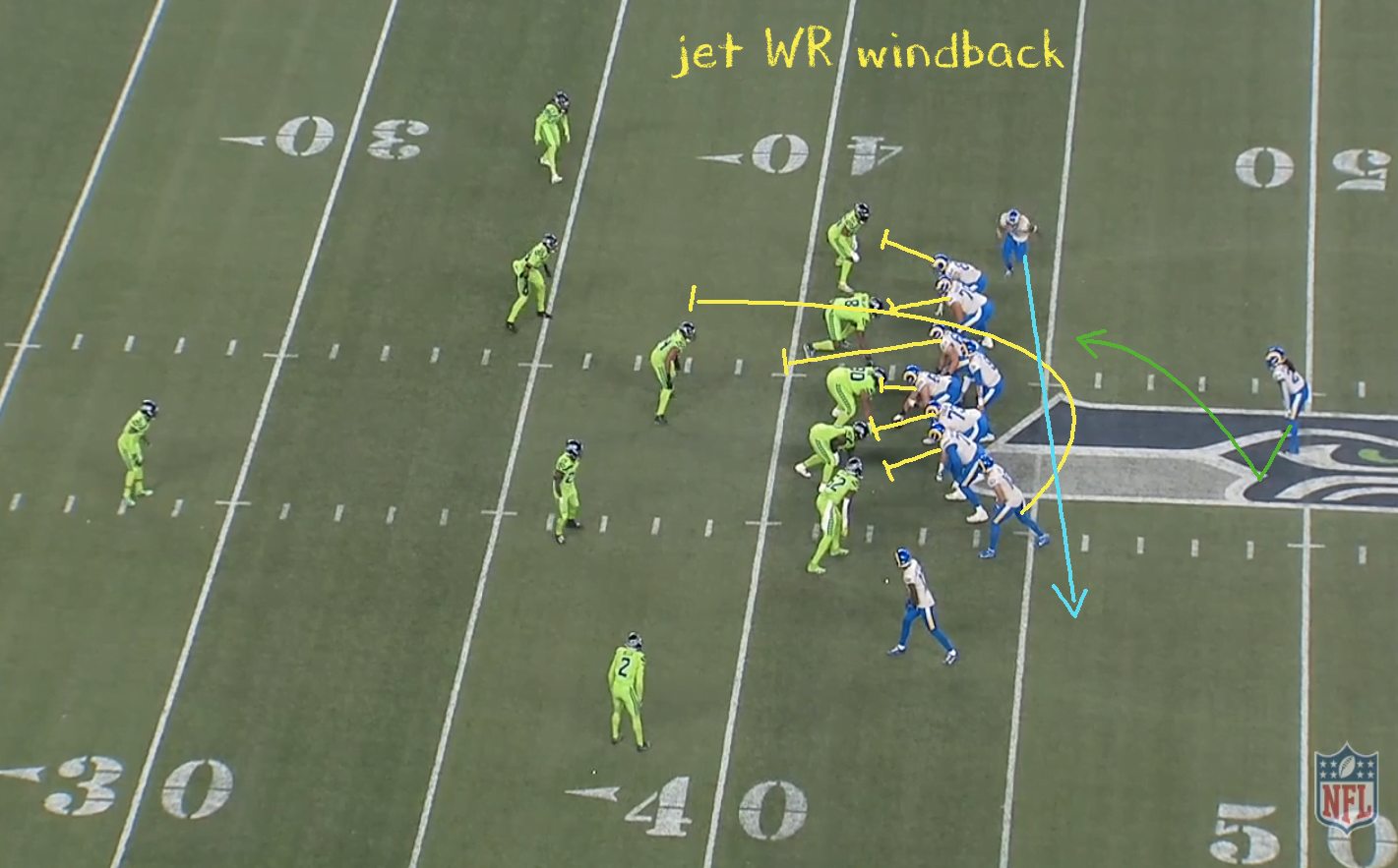 Ez egy jet WR split zone, ami annyit tesz, hogy van egy jet motion balra (Robert Woodstól), illetve hogy nem egy tight end, hanem egy elkapó (Cooper Kupp) adja a keresztező blokkot jobbra.