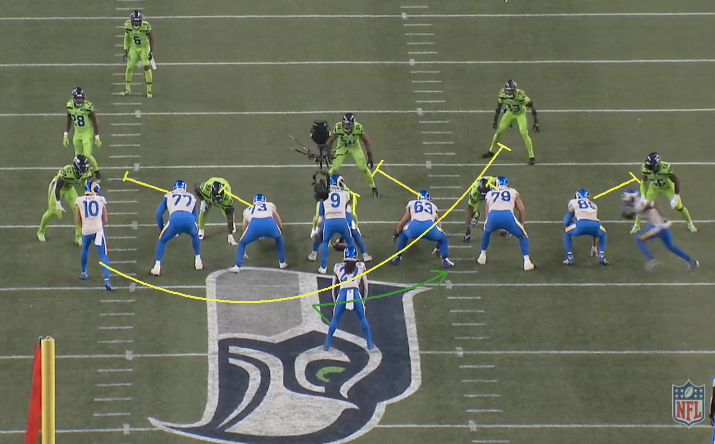 Erre mutatok egy példát a Ramstől a Seahawks elleni csütörtök esti meccsről. Az első játék, amire majd később építünk az egy split zone play kicsit megbonyolítva. A split zone játékokról már írtam korábban, lehet érdemes felfrissíteni a tanultakat ebben a cikkben.