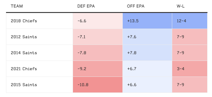 Ennek kapcsán felelevenedhet bennünk a Saintsnek az a pár éves időszaka, amikor Breesszel kiváló volt a támadósor, de a védelem annyira rossz volt, hogy még a pozitív mérleget sem sikerült elérni három különböző szezonban. Sheil Kapadia szedte össze a támadó- és védő EPA adatokat a 2012-es, 2014-es, 2015-ös Saintsre, illetve a 2018-es és az idei Chiefsre vonatkozólag, amit alább láthattok: