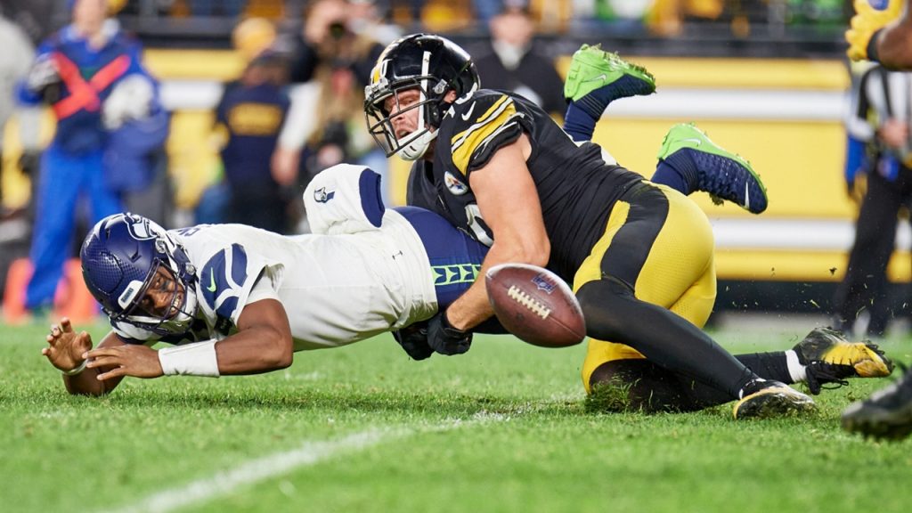 TJ Watt is absurd. Seattle slides protection towards him and has as many as 4 guys on him, but he still chases down Geno and strips him pic.twitter.com/yhNvD6FcWz