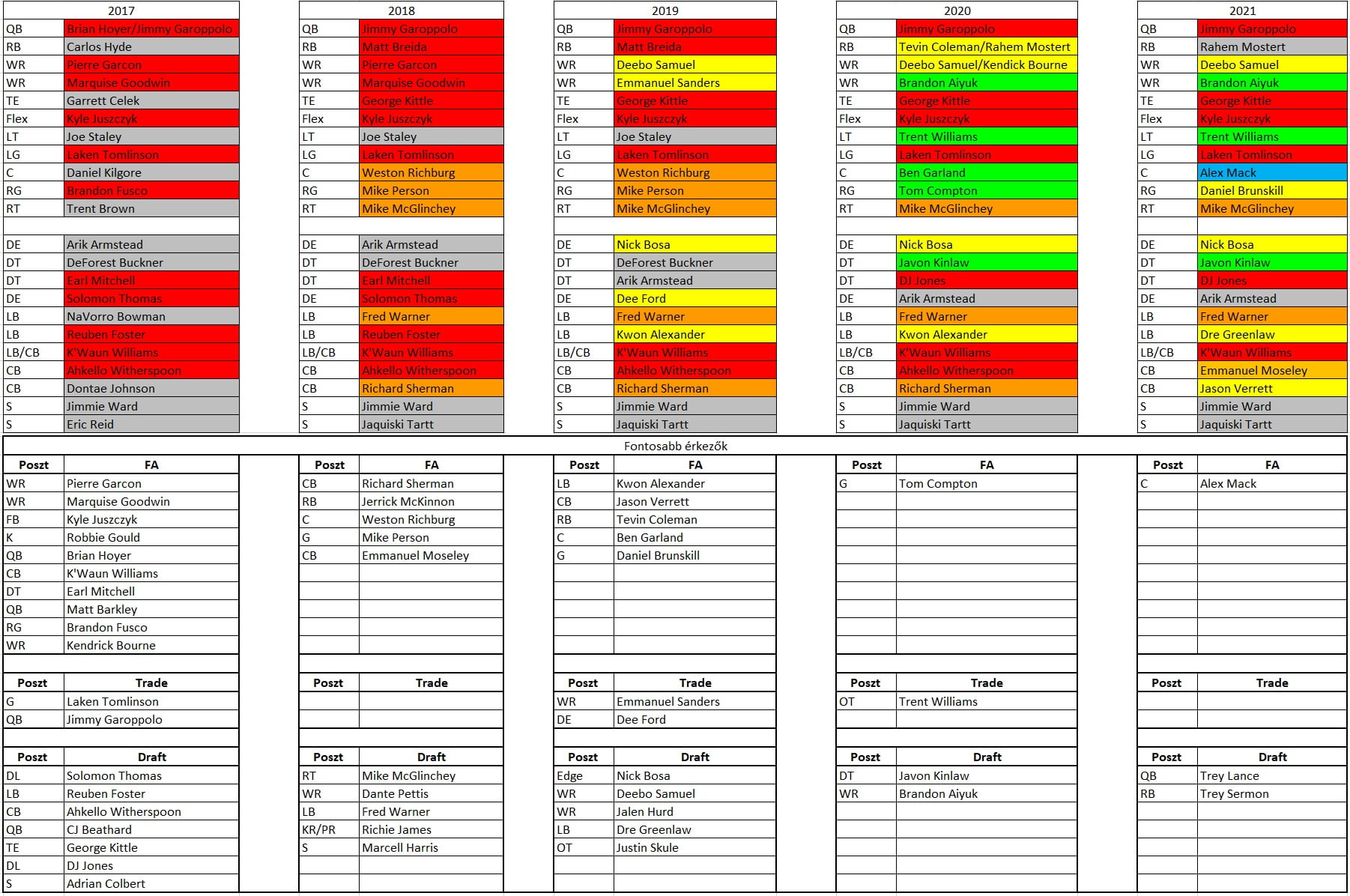 A koncepció egyszerű volt: 2020-ban bajnokságot akart nyerni a 49ers, de a sérülések közbe szóltak, ráadásul végérvényesen kiderült, hogy Jimmy Garoppolo (aka Alex Smith) nem megoldás, így húztak egy új irányítót (aka Mahomes), aki majd egy sikeres, pozitív 2021-es idény után átveszi a stafétát. A sikeres idény viszont ahogy tavaly, úgy idén sem akar összejönni és ma már csak nagyon kevesen gondolják úgy, hogy Shanahan az új Andy Reid. De maradva a csapatépítésnél (szürkével a 2017 előtt is a rosteren lévő játékosokat jelöltem, míg pirossal a 2017-ben, naranccsal a 2018-ban, sárgával a 2019-ben, zölddel a 2020-ban, kékkel pedig a 2021-ben érkezetteket – a képre kattintva ki lehet nagyítani):