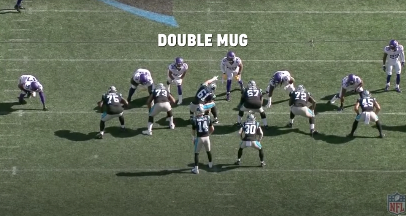 A Panthers viszont nem a felállás szerinti várható embereket küldi az irányítóra. Középről a linebacker Carter és szélről a pass rusher Reddick visszalép coverage-be, ellenben a másik linebacker, Shaq Thompson (#7) érkezik, ráadásul a visszalépőkkel ellentétes oldalról.