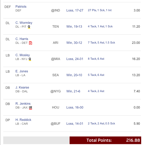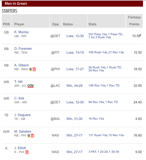 Men in Green kezdőjében hárman is 20 pont fölött termeltek, köztük egy védőfalember. A prímet Tyreek Hill vitte a 32,80 pontjával, illetve jó pick volt még Foremen és Kirk is, egyikük sem egy hagyományosan sokat termelő játékos.