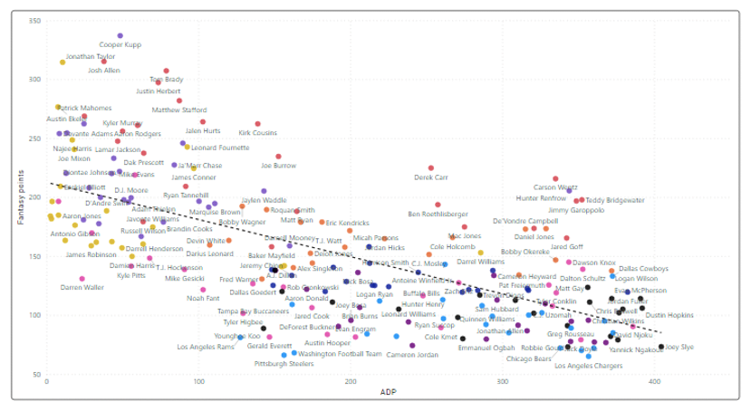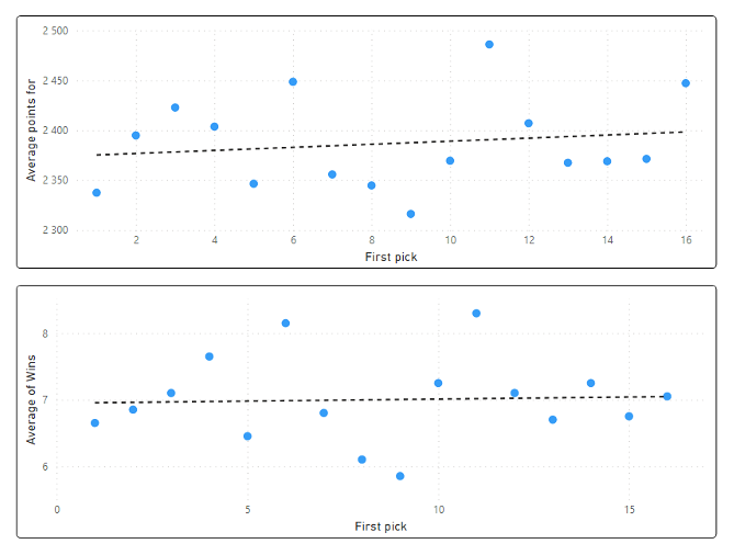 Egy sikertelen alapszakasz során sokan szokták arra fogni a gyengébb teljesítményt, hogy hátulról draftolva nem lehet sikeresen szerepelni. Aki így gondolkodott eddig, azt sajnos el kell keserítsem, nem igazán van semmilyen korreláció a draftpozíció és a szerzett pontok között. A 2021-es alapszakaszban a 6., 11. és 16. helyen választók szerezték a legtöbb pontot. Érdekes módon azonban ez győzelmekben nem feltétlenül mutatkozott meg, főleg az utolsó pick birtokosai voltak szerencsétlenek a szerzett pontokhoz képest.