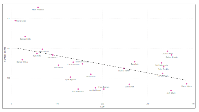 TE – Tight end poszton is igazolódni látszik, hogy valaki vagy kihúzza az elején a legjobb játékost (ez idén Mark Andrews, de a biztos pickek, mint Kittle vagy Kelce is jó teljesítettek) vagy nagy szerencséje van és a hátsó körökben sikerül kifognia azt a random generátor által kidobott TE-t, akinek összejön egy kiemelkedő szezon (Knox, Schultz). Átmenet a kettő között gyakorlatilag nincs, szerintem ez a poszt volt idén is a legkiszámíthatatlanabb fantasy szempontból. Érdekesség, hogy a TE-k közül a rossz teljesítménye ellenére Gerald Everett hozott szerencsét a csapatoknak, az őt draftolók 55%-a jutott rájátszásba, ami a TE-k között a legjobb arány.