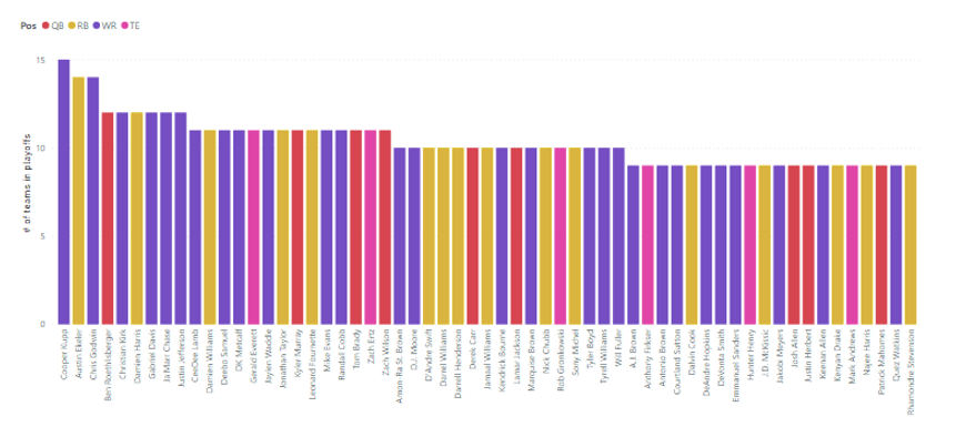 WR – Döntő faktor lehet egy RB, kivéve akkor, ha valaki kihúzta Cooper Kuppot, aki idén a legtöbb fantasy pontot gyűjtötte be az első 14. héten, egymaga megnyerve így az alapszakaszt számos csapatnak. 5 alapszakasz győztes csapatban is szerepelt és a tulajdonosainak a 80%-a bejutott a rájátszásba, ami a legjobb arány az összes pozíciót és játékost figyelembe véve. A többiek nagyjából a draftpozíciójuk alapján várt teljesítményt hozták, talán Renfrow-val lehetett még nagyot nyerni, aki kvázi utolsó körös választottként hozott a csapatoknak első körben kiválasztott WR-ekkel összehasonlítható számokat.