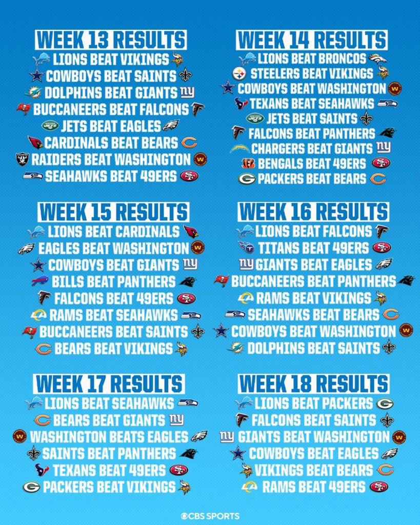 Ezen kívül nyilván segíti a Lions dolgát, ha bármelyik AFC-s csapat diadalmaskodik egy NFC-ssel szemben, és ha a jelenlegi top5 gárda a konferencián belül veri a rosszabbul állókat.