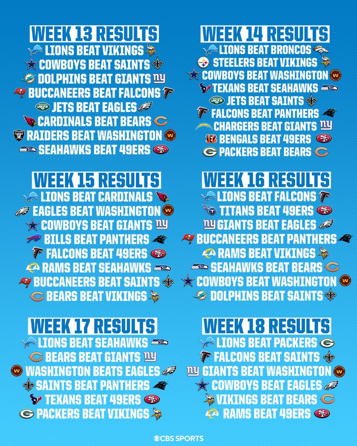 Az NFL on CBS Twitter fiókja mutatta meg, hogyan néz ki az út a Lions előtt a playoffba. Ezek szerint 46 Lions számára kedvező eredmény szükséges ehhez, azonban jó hír, hogy az első már teljesült is, hiszen a Cowboys az éjjel megverte a Saintst. Már csak 45 van hátra!
