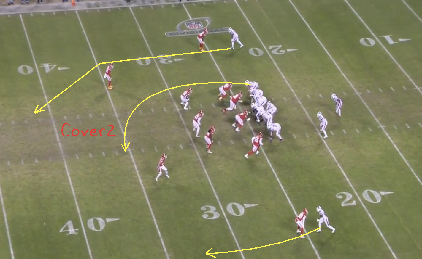 A Chiefs Cover2-vel védekezik, a Bills pedig egy olyan játékot rajzol fel, ami az egyik safetyt hozza kellemetlen helyzetbe. Ha fellép a csalira, akkor megy mögé a passz, ha hátralép, akkor pedig előtte lesz tök üresen a tight end, főleg hogy play actionnel indítja a játékot a csapat.