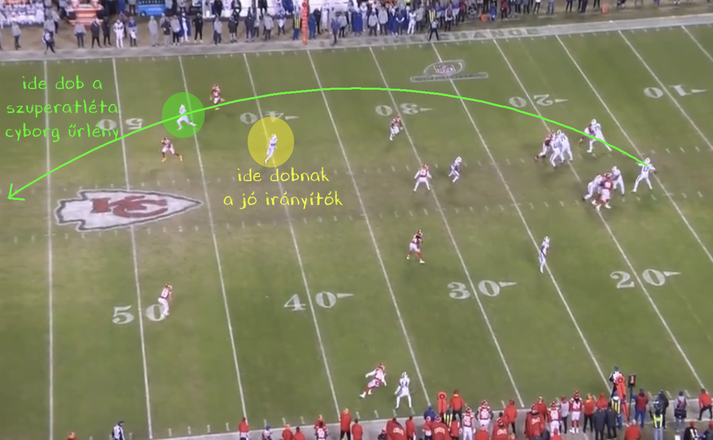 A jó irányítók ilyenkor automatikusan megdobják Knoxnak a labdát és nem is gondolnak arra, hogy Davis felé nézzenek, hiszen a safety hátrált vele. Igen ám, de itt egy szuperatléta cyborg űrlénnyel van dolgunk, aki fogta magát, betöltötte az ágyút a karja helyén és eleresztette a rakétát…