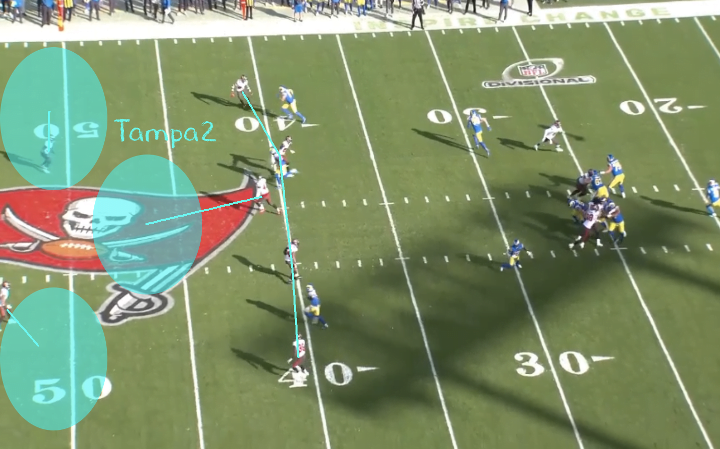 A Buccaneers pedig igazából tökéletes játékhívással válaszolt erre a helyzetre. Tampa2 volt a koncepció, ahol négy underneath védő védi a first down vonalát, a két safety felelős a pálya mély részének egy-egy feléért, ráadásul középre nem is igazán kell figyelniük, oda ugyanis hátramozog a középső linebacker, így igazából hárman védik a hátsó zónákat.