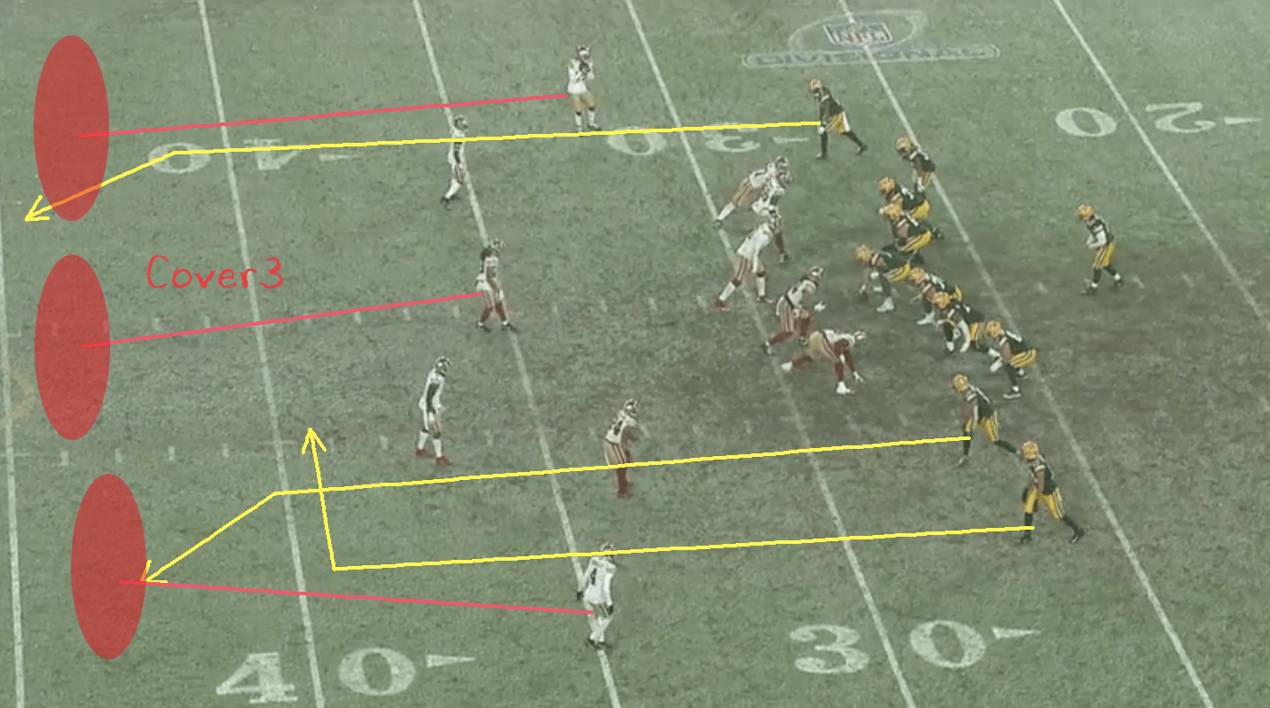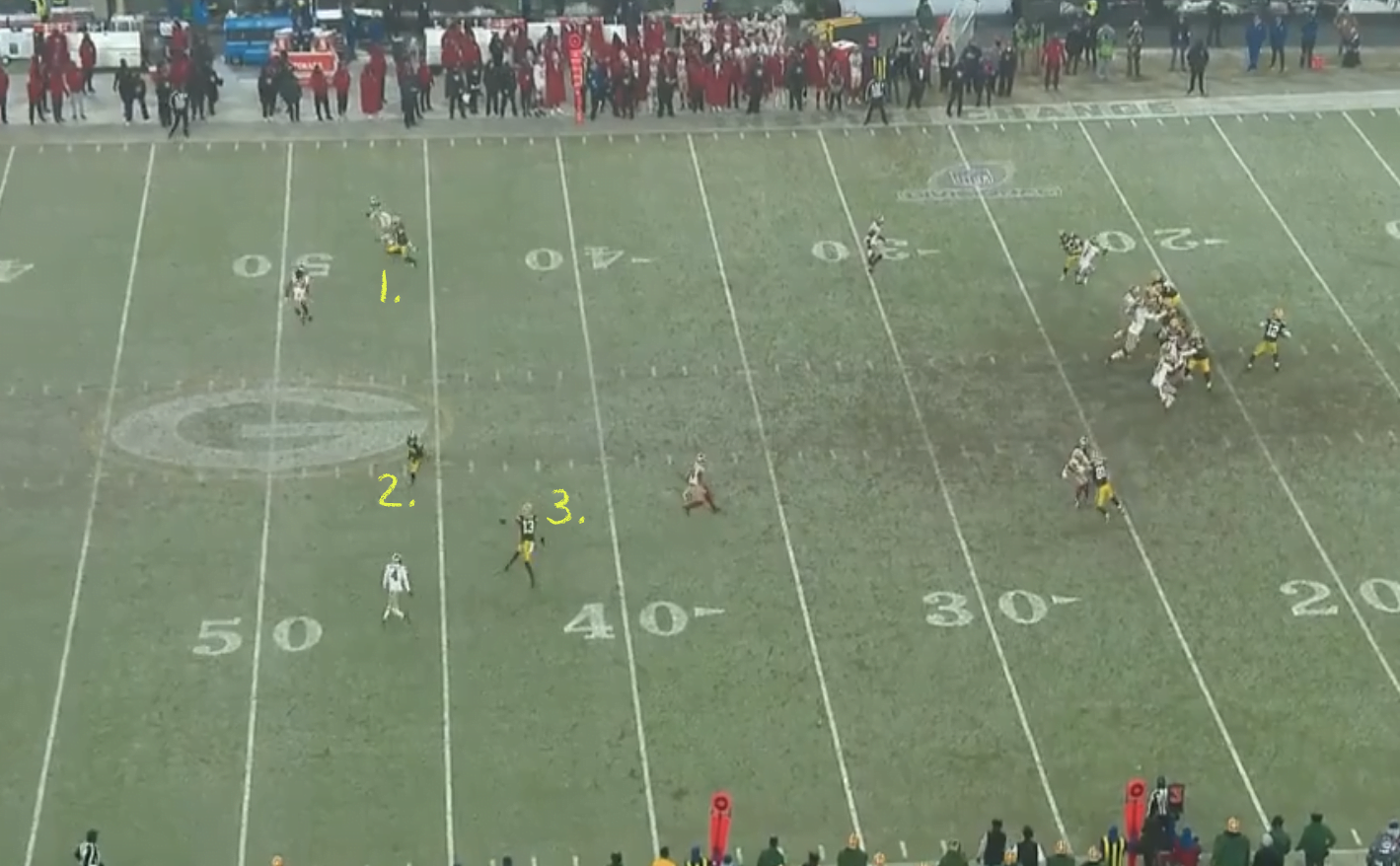 Matt LaFleur egy teljesen jó játékot hívott be, főleg utólag látva a 49ers védekezését, ami alapjaiban egy Cover3 volt (a frontot kicsit megkavarta Ryans, de hárman védekeztek mélyen, ez a lényeg most). A képernyőn fent Adams fut egy postot, alul St.Brown egy cornert és Lazard egy in-t.