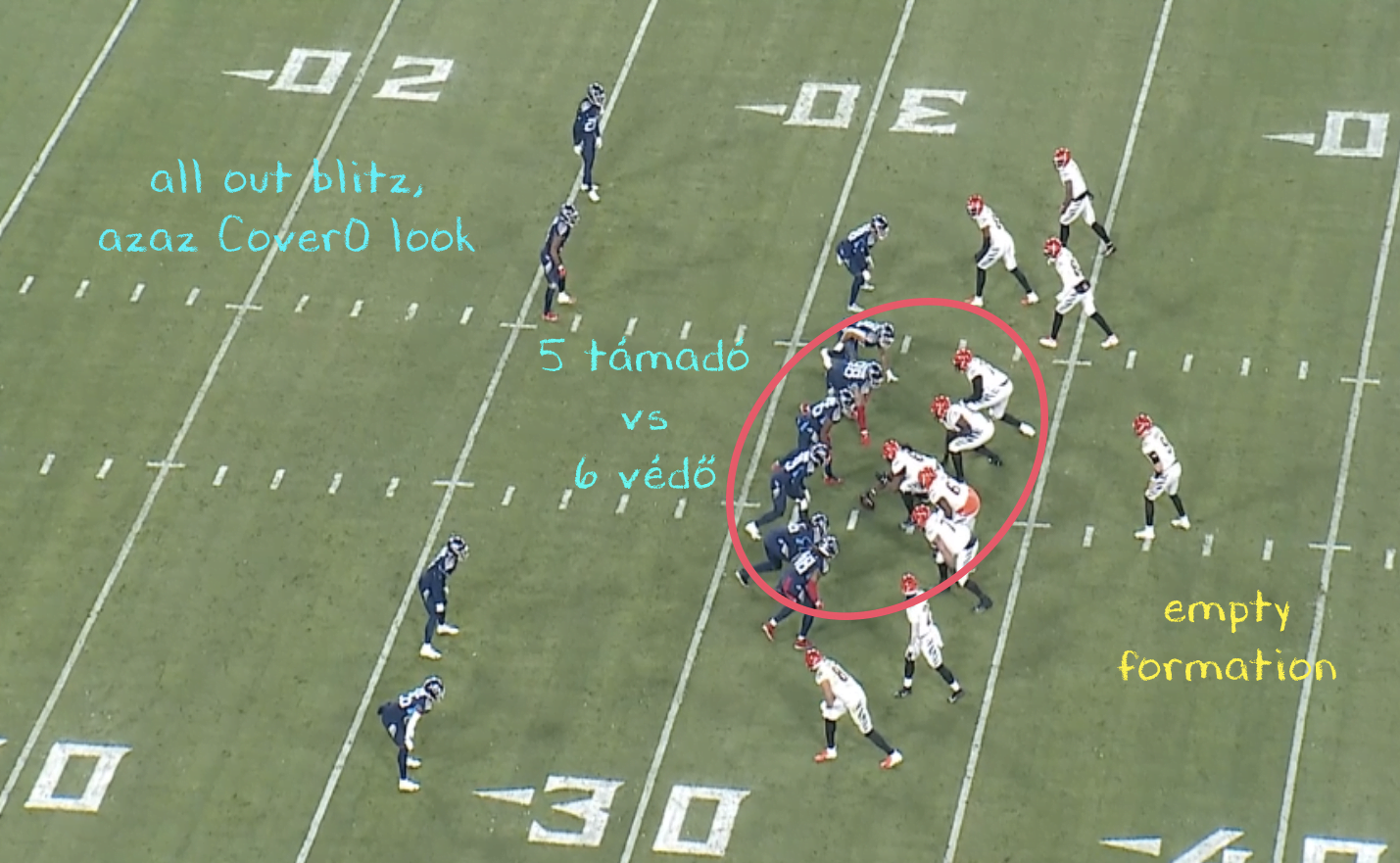 Ezzel sikerül azt elérni, hogy mindössze három rusherrel is legyen egy blokkolatlan emberük. És ez ellen nincs ellenszere a támadófalnak. Egyszerűen semmit sem tudnak csinálni, fixen lesz egy blokkolatlan rusher, úgyhogy az irányítónak ezt tudnia kell és gyorsan kell passzolnia.