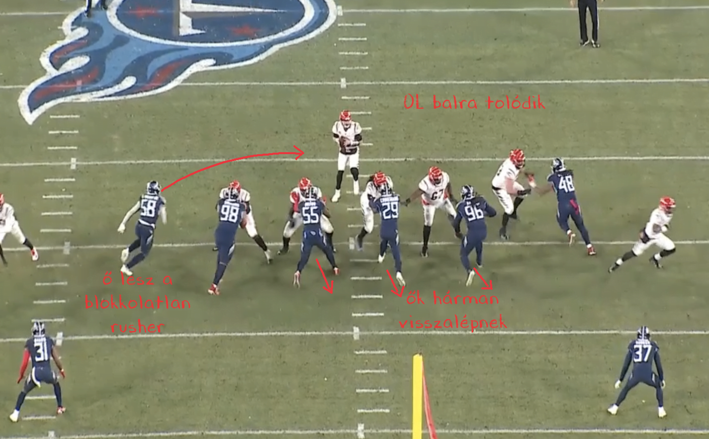 A Titans 9-szer (!) sackelte Joe Burrow-t hétvégén. A legkönnyebb ezt a támadófalra fogni, és részben ők a felelősek a sok zsákolásért, de Joe Burrow-t és Zac Taylort is lehet kritizálni. No meg lehet dicsérni a Titans védelmét. Most egy olyan példát hozok, ahol a támadófal 0%-ban felelős a sackért.