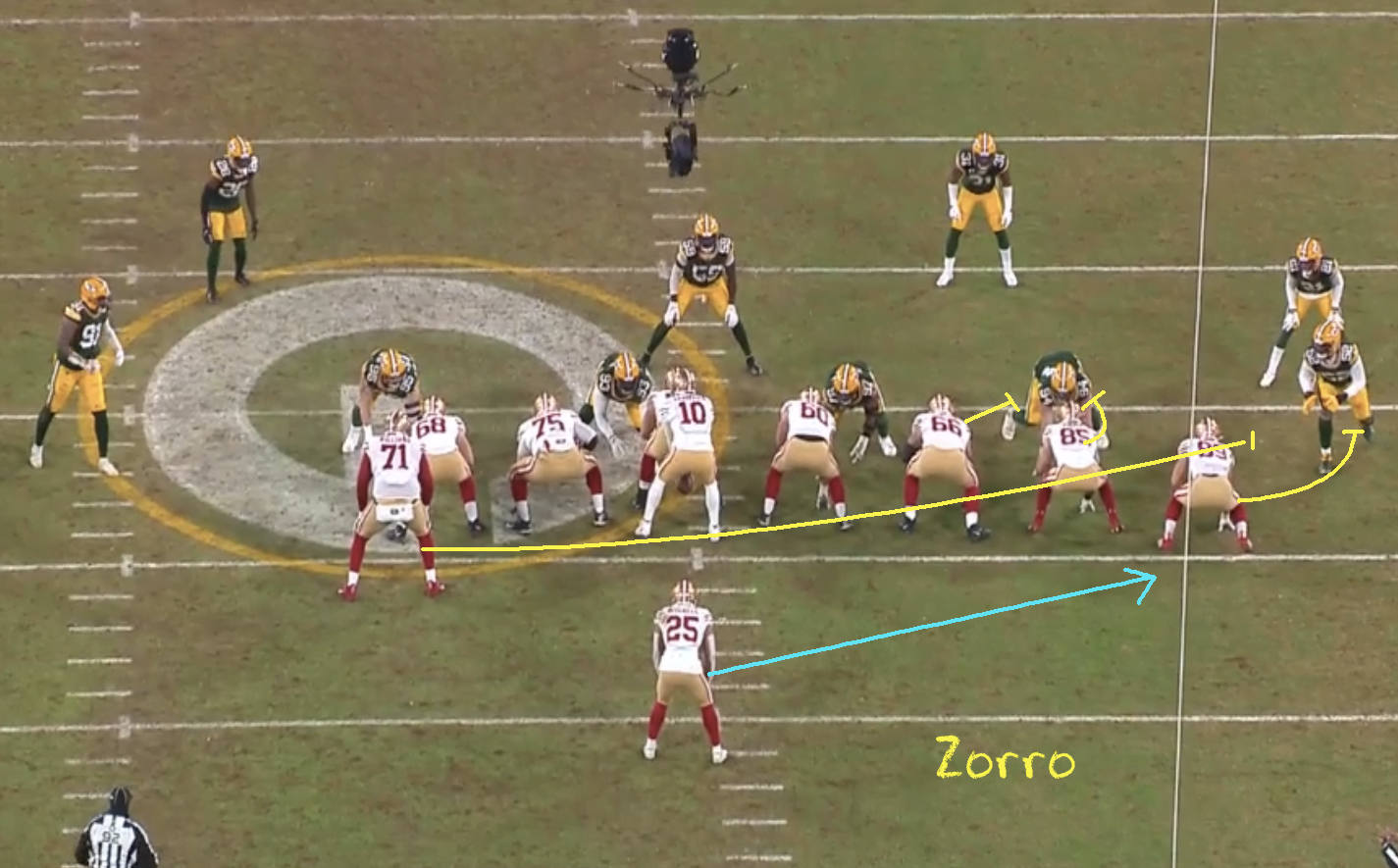 A Zorro egy outside zone futójáték az erős oldalra (a tight end oldalára), ahol általában egy fullback is van a pályán. Shanahan ezt sokféleképpen szokta futtatni, van amikor két futóval a backfielden, van amikor Deebo Samuellel futva vagy épp vele blokkolva, most pedig egy olyan variációt hozott, ahol feltette a liga legjobb tackle-jét, Trent Williamst fullbacknek, akinek így kulcsszerepe volt a játékban.