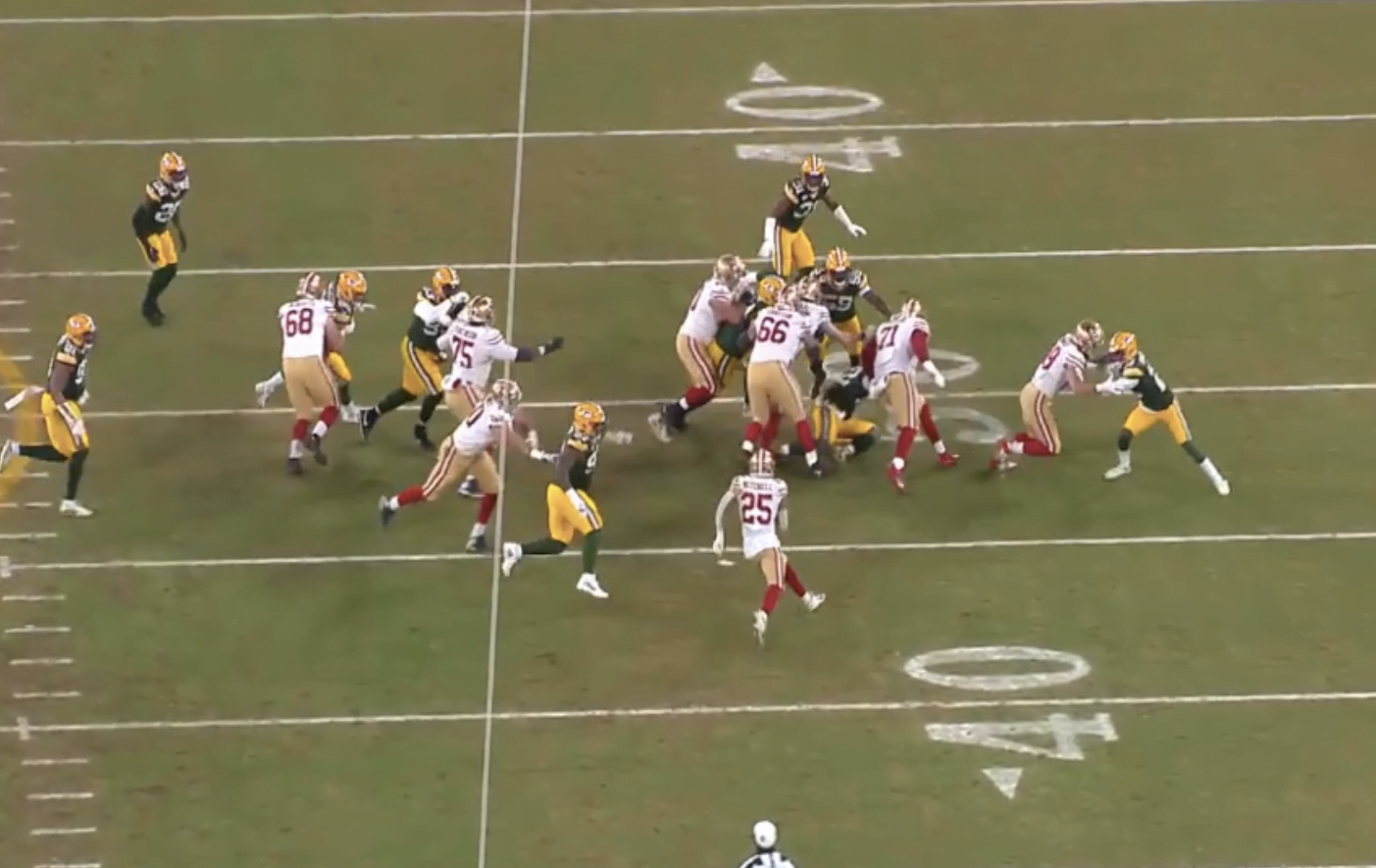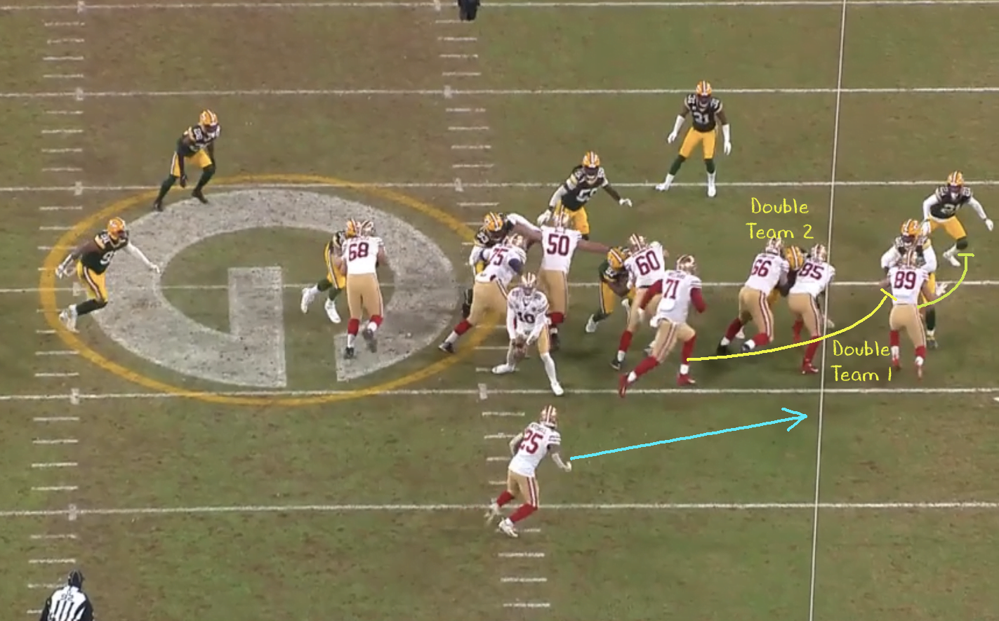 Jobbra megy a játék, ott van az erős oldal két tight enddel. A szélső tight end (Charlie Woerner, #89) és a fullback posztról induló Trent Williams (#71) blokkolja meg a szélső védőt (Rashan Gary, #52), miközben eggyel beljebb George Kittle (#85) és Tom Compton (#66) is kioszt egy double teamet Dean Lowrynak (#94), Garoppolo dob egy tosst Elijah Mitchellnek, aki pedig indulhat is a szél felé.