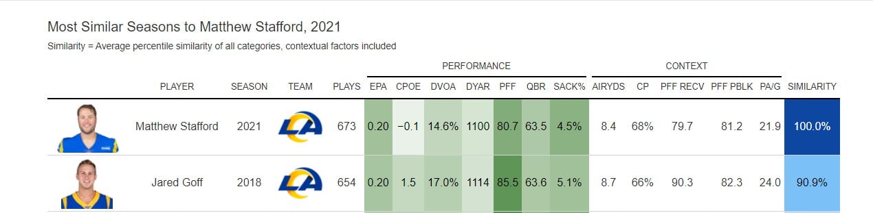 Csak hát Goffnak ebben az idényben kezére játszott a liga egyik legjobb futójátéka. Amikor a következő 2 évben átlag alatti/átlag futójáték (és nyilván passzblokkolás) volt mögötte akkor nagyon beszakadt a teljesítménye. Stafford ugyanolyan körülmények között (talán a futójáték még rosszabb is) egy top 10-es támadósort vezet. Nem nagyon lehet kérdés, hogy a Rams örül ennek a cserének.