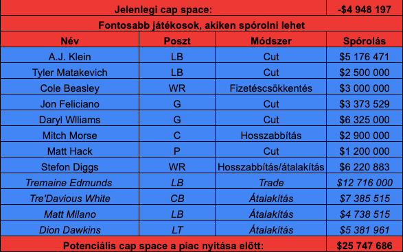 A végére maradtak az átalakítások, melyek segítségével a Milano- White- Dawkins hármasnál elég sok pénzt lehetne megtakarítani (akár 17 és fél milliót), de valószínűleg ezekhez nyúlnak legkésőbb a csapatnál. Akinél biztos lehet valamire számítani, az Stefon Diggs, akinek egy új szerződéssel muszáj lesz csökkenteni az idei 18 milliós cap hitjét.