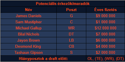 A csapat cap helyzete nem jó, de nem is tragikus, hogy egy klasszikust idézzek. A 26 millió elérhető cap space a liga középmezőnyébe elég és alapvetően lehet vele mit kezdeni. Azonban ezt az összeget nem igazán tudja a csapat tovább növelni. 7 millió dollárt tudnak spórolni két könnyen megléphető cut segítségével. Eddie Goldman évek óta vagy nem játszik vagy nem azon a szinten mint karrierje elején tette, Jeremiah Attaochu pedig nem több egy idősödő csere pass rushernél. Elküldeni mást nem is igazán éri meg a csapatnak. Tudnak még egy kevés összeget felszabadítani, ha Roquan Smithnek, a csapat egyik legjobb védőjének adnak egy hosszú távú szerződést. Ennek mértéke persze az adott szerződés kialakításán múlik, de nem érzek nagy kockázatot egy közel All-Pro szintű fiatal játékos hosszú távú leláncolásában.