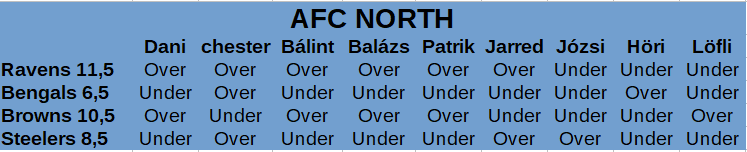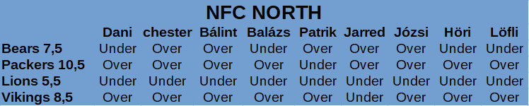 Meglepetésre az elvártakhoz képest az NFC északi divíziója volt az egyik legalulteljesítőbb az NFL-ben, hiszen három franchise sem érte el a line-t. A Vikings nagyon közel volt hozzá, de végül ez nem csak az over tippünkbe, hanem a teljes stáb állásába került. A Bears irányító helyzete nem könnyítette meg a dolgokat, Fields lassan vette fel az iramot, és hiába volt egy-két jó meccse, összességében 7 vereség alkalmával is ő irányított. A Lionsből senki nem nézte ki tőlünk, hogy 6 győzelmet szereznek, és erre visszaigazolást kaptunk a szezon során. Rossz volt a meccseiket nézni, noha a nyeretlen sorozatuk közben volt bőven 1-2 olyan, ahol megérdemelték volna a W-t. A Packersben csak Patrik kételkedett, de a magas line-t ismét simán ugrották LaFleurék.