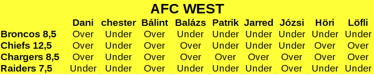 Imádtam ezt a csoportot, nézzétek csak meg Bálint és az én tippsoromat, hogy a két véglet találkozott itt. A legnagyobb meglepetés egyértelműen a Raiders volt, amely nem csak a szezon előtti, de a szezon közbeni elvárásokat is lesöpörte az asztalról, és bemasíroztak a PO-ba a special team koordinátorból avanzsált ideiglenes vezetőedzővel, botrányoktól hangos sajtóvisszhangban. Ezzel szemben a Chargers a másik véglet, amely ilyen irányító játékkal nem érte el a rájátszást, de hát végülis a Chargersről beszélünk… A Broncos szóra sem érdemes, Bridgewaterrel a 9 győzelem elég távolinak tűnt, ráadásul még Locknak is be kellett ugrania párszor. A Chiefs is érdekes, a magas line engem mindig elbizonytalanít, hiába egy jó csapat és eggyel több forduló volt teljesíteni ezt a határt, és ha a szezon kezdését nézzük, akkor nemhogy ez a line, de a playoff is kezdett messze kerülni. Aztán a védelem ismét összeállt, és ha be-becsúsztak Mahomesnak azok a WTF dobások/döntések amik jellemezték az idény elejét, akkor a defense legalább tudta kompenzálni. Viszont ez is kevés volt ahhoz, hogy 13 győzelemmel zárják az évet.