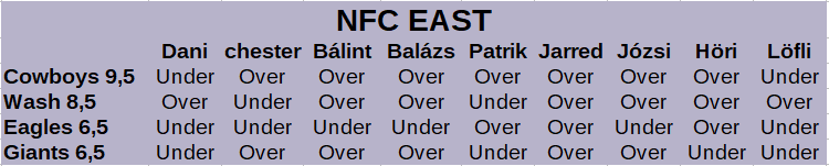 2020-ban negatív mérleggel sikerült behúzni a csoportot, úgyhogy nem meglepő, ha Vegas nem emelte az egekig a line-okat. A csoportgyőztes Washingtonnak gondolhattuk azt, hogy azt a hiányzó két győzelmet Ryan Fitzpatrick és a megerősített keret képes lenne szállítani, de mindenki kedvenc szakállas irányítója nagyon hamar lerendezte a szezonját sérülés miatt, Heinicke-vel egy 17 meccses periódust nem lehet végig vinni, a védelem pedig, ahogy várható volt, nem tudta fenntartani a tavalyi szintet, és ezen a Young-Sweat kettős kiesése sem segített. A Giants szintén nagy reményekkel várhatta az idényt a tavaszi erősítések után, de Joe Judge teljesen félresiklatta az egész vagont, amikor pedig Mike Glennonnak kell játszania, akkor inkább bele se nézel a meccsekbe. Az Eagles kihasználta a könnyebb sorsolását, a szezon második felében 1-2 kivételtől eltekintve az azonos szintű, vagy náluk gyengébb csapatokat simán verték, a Cowboys pedig sokáig bajnoki címre esélyes formát mutatott, hogy aztán ismét one and done-nal zárja a rájátszást.