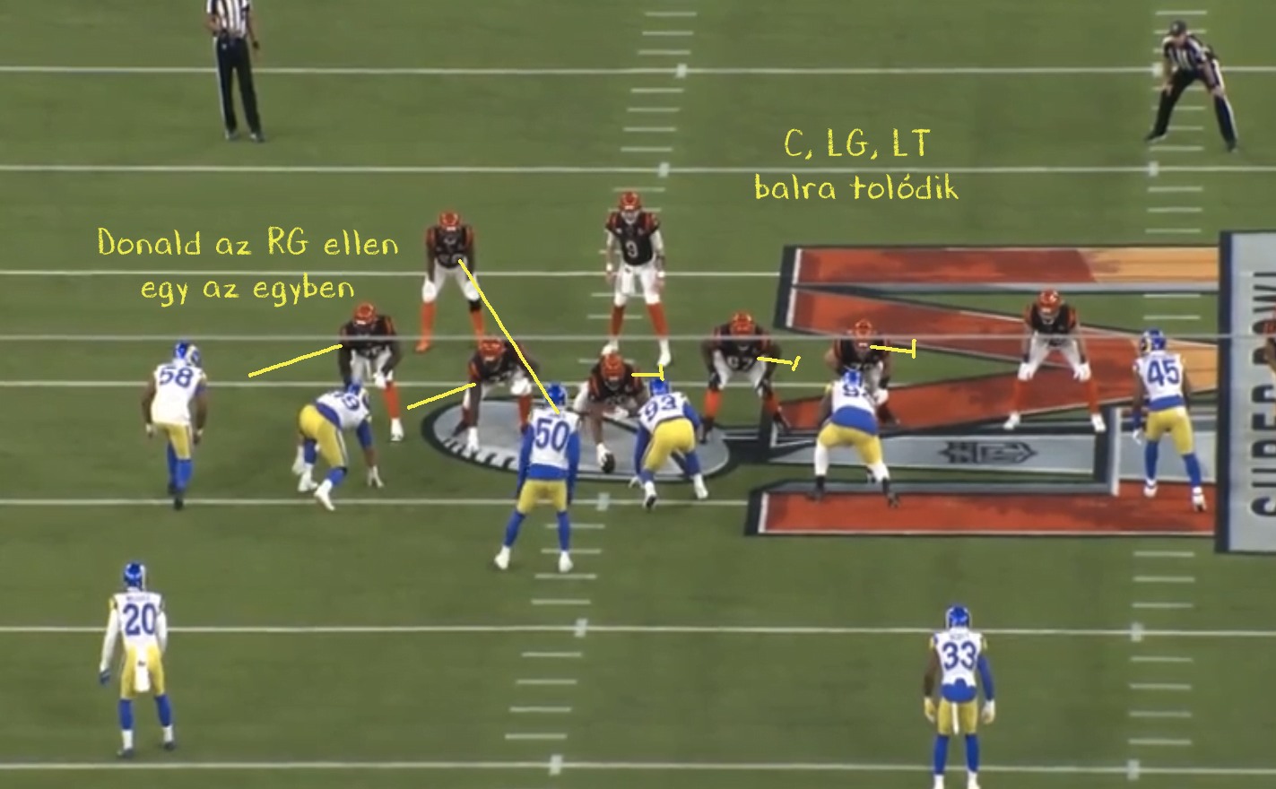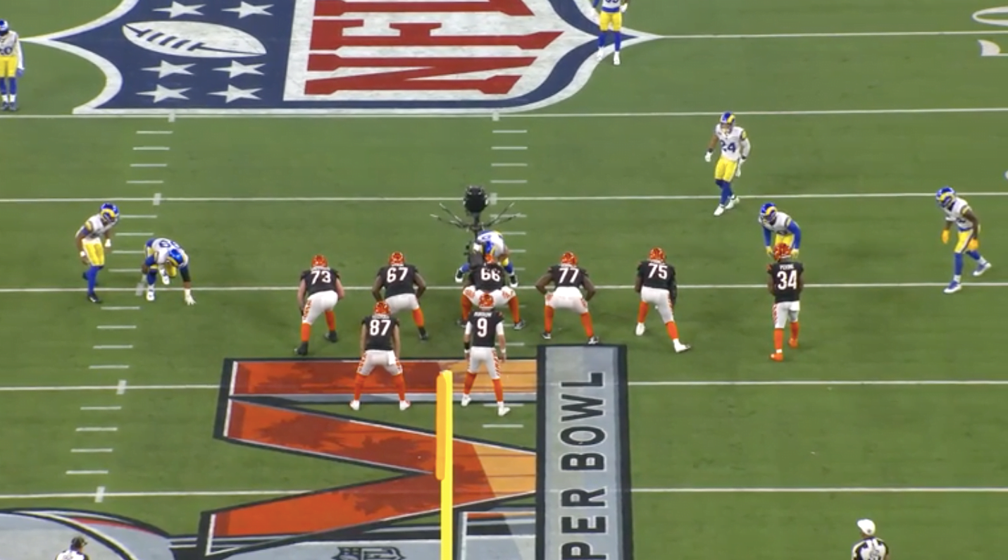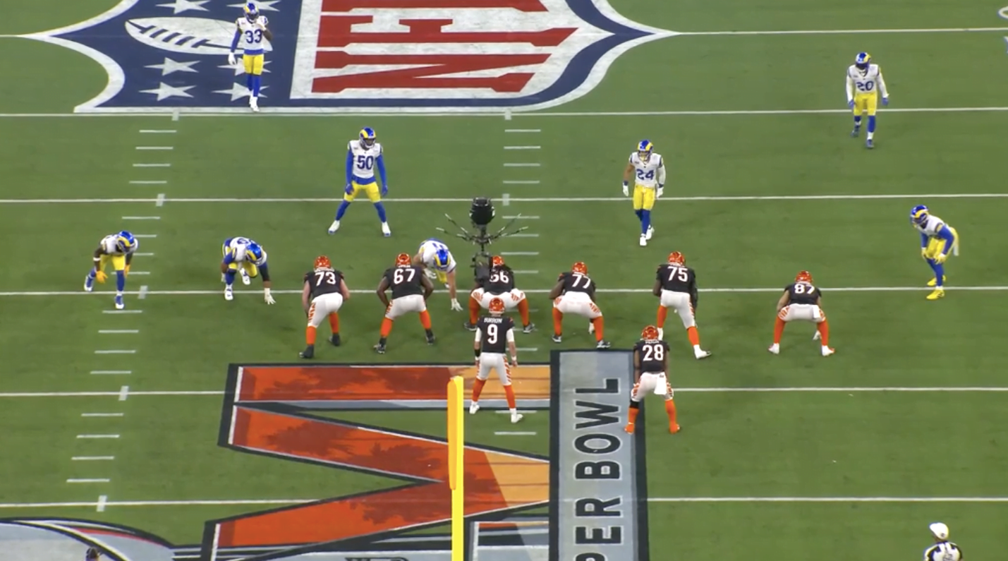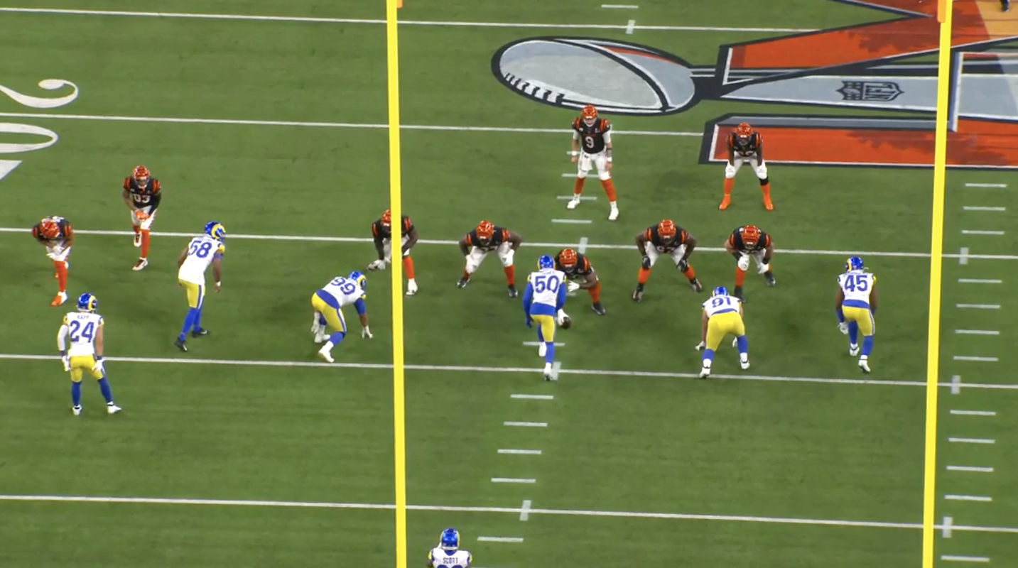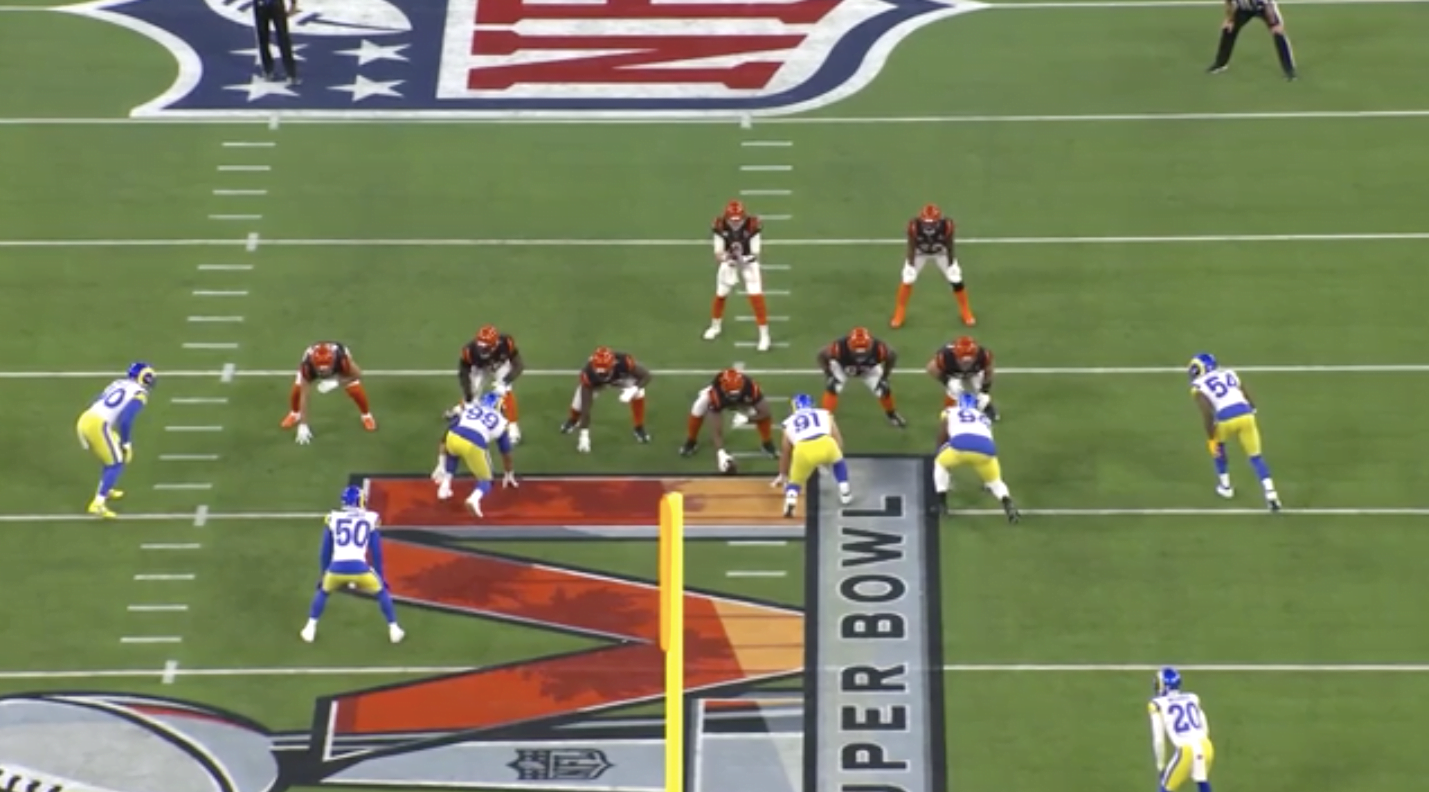 A Rams öt emberes frontot tett fel a pályára, ebből három a támadók bal oldalán helyezkedett el, Donald ellenben a jobbon. Ez a felállás azt eredményezi, hogy a támadófalnak balra kell tolódnia, hogy azon az oldalon felvegyék a három embert. Így tudják, hogy Donald egy az egyben lesz, ennek kivédésére a Bengals azt találta ki, hogy akkor Mixon bent marad protectionben és besegít Donaldra.