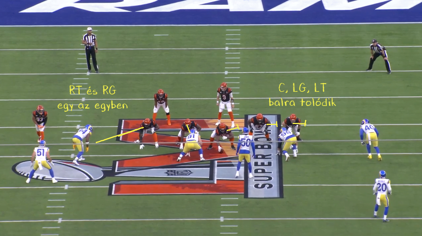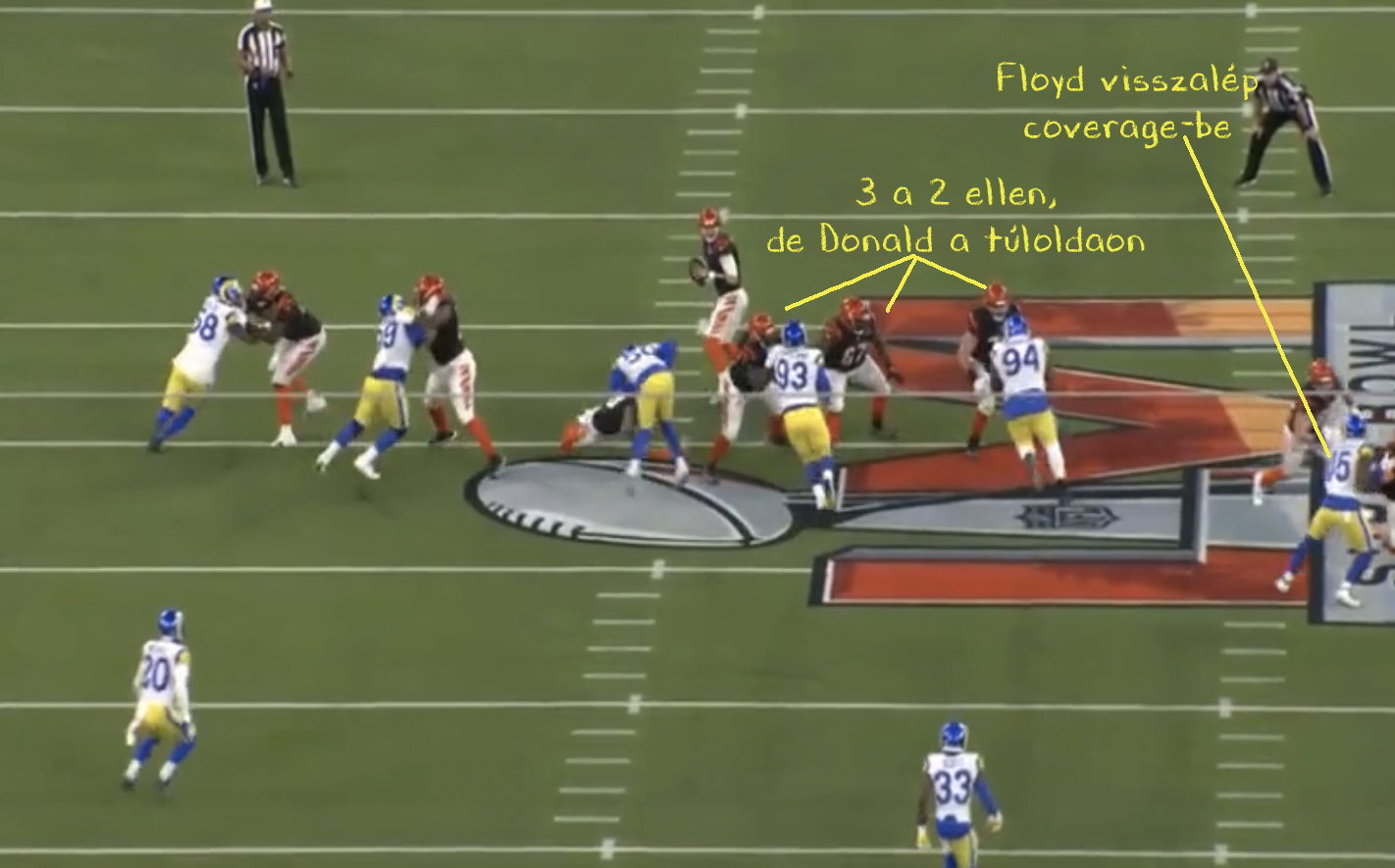 Másrészt a Bengals nyilván nagyon félt Donaldtól, úgyhogy megmondták a center Trey Hopkinsnak, hogy amikor csak lehet (tehát ha neki nincs külön embere protectionben), a snap után azonnal forduljon Donald irányába és segítsen be a guardnak. Mivel a Rams főleg egy sztenderd négy emberes rush-sal operált az első félidőben, így ez működött is. Így tehát a félidő jelentős részében duplázva volt Donald, ezt kombinálva a gyors passzokkal pedig sikerült semlegesíteni a liga legjobb játékosát és a Rams védőfalát.