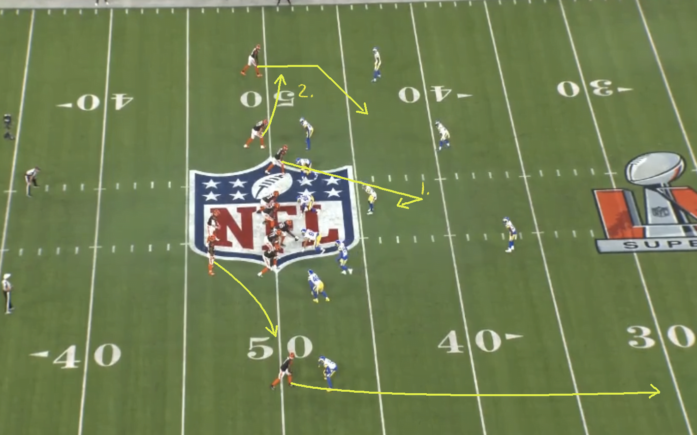 A Rams két mély safetyt mutatott snap előtt, de a snap pillanatában/után Weddle felmozgott és így kialakítottak egy bracketet Boydon, tehát gyakorlatilag beduplázták, hogy felé ne mehessen a labda – várható volt, hogy ilyen helyzetben támaszkodhat rá Burrow. Ezen kívül is emberezés volt egyébként a hívás.